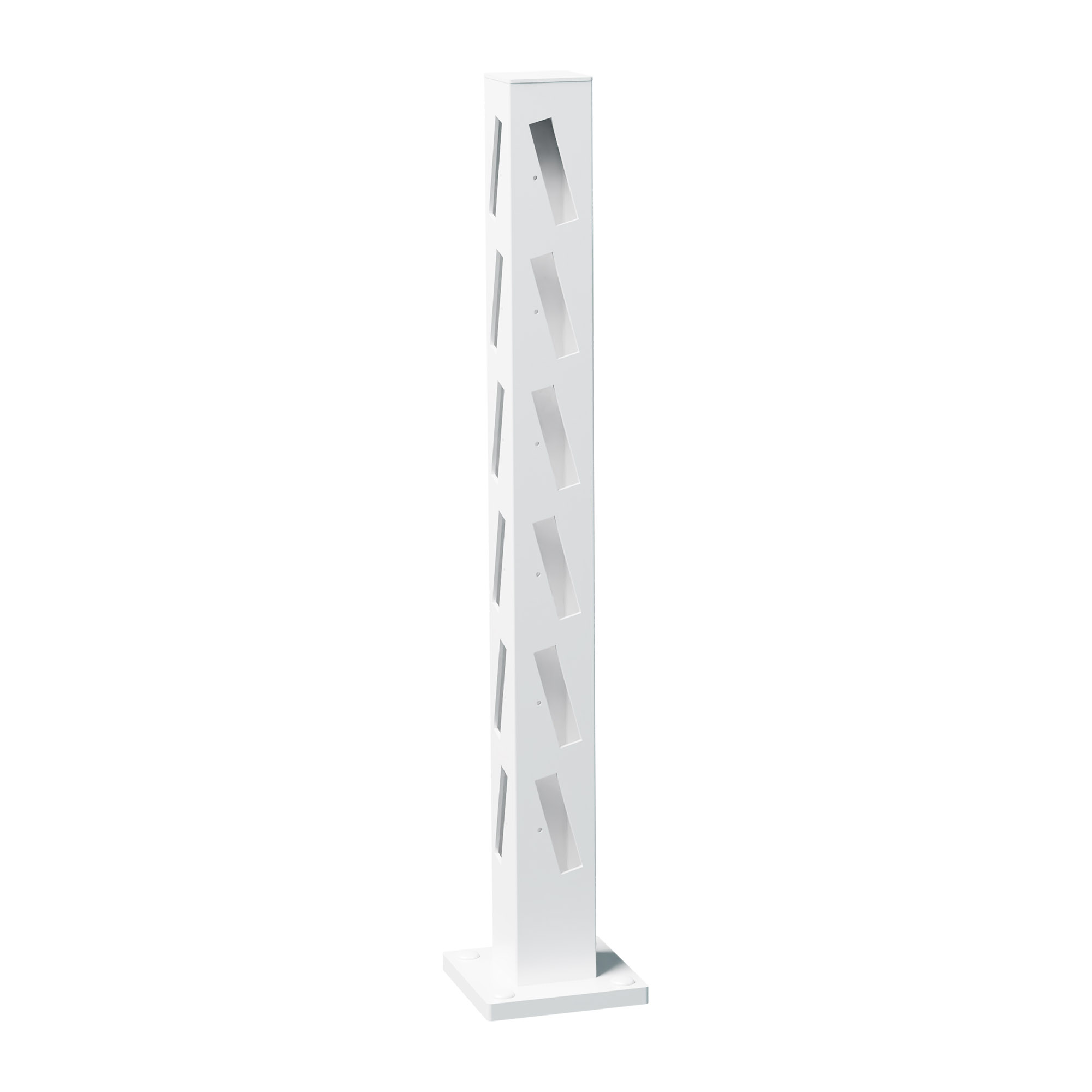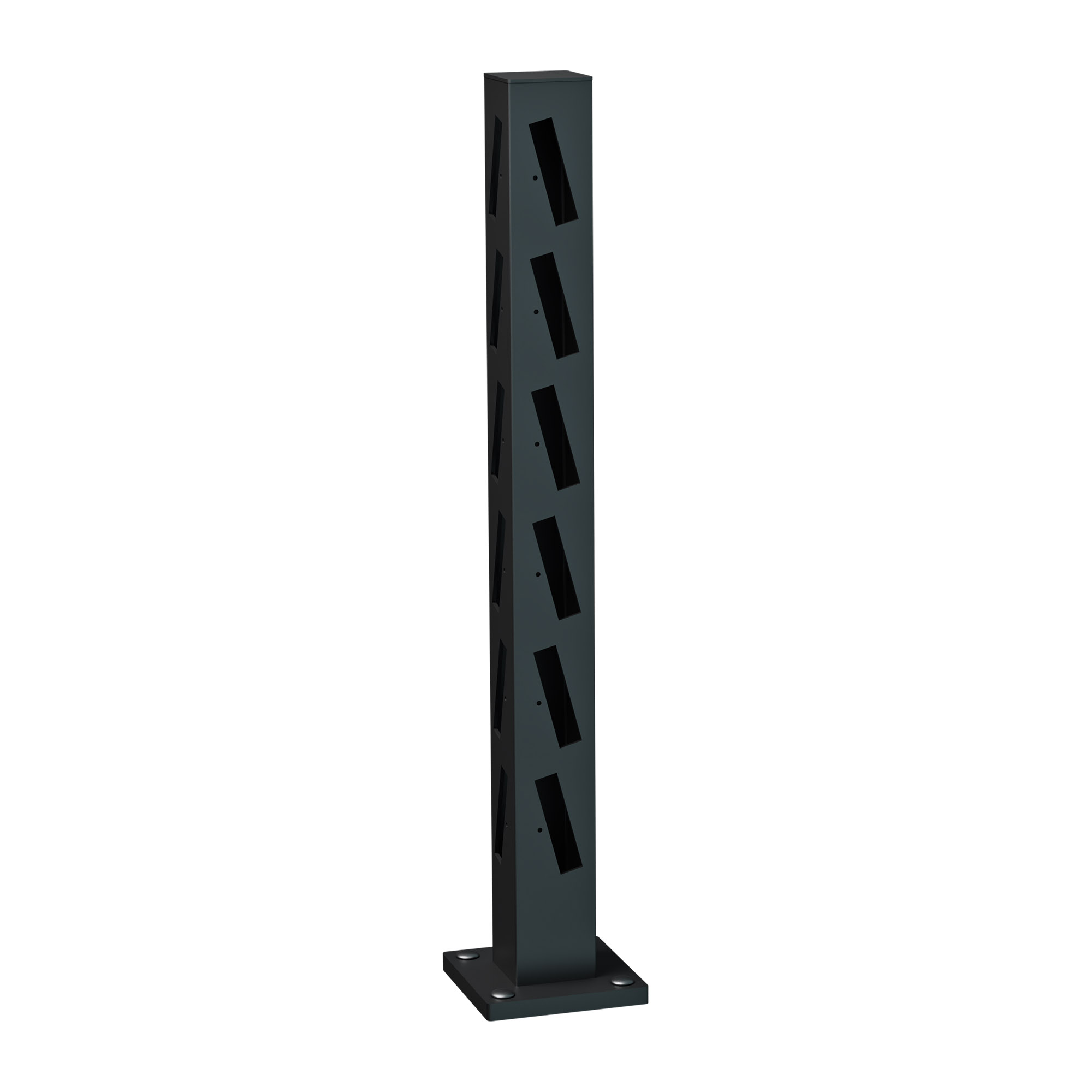 Avståndet mellan marken och första regeln är 10 cm. Avståndet mellan reglarna är 1,5 cm. Hålen är 23 X 97mm. Tänk på att beställa rätt stolptyper för ditt ändamål (mellanstolpar, hörnstolpar, ändstolpe höger eller ändstolpe vänster). För ändstolpe så titta alltid inifrån och ut på staket för att välja höger eller vänster. Stolphatt går att få i svart plast eller av aluminium i valfri kulör. Glöm inte att beställa en stolpfot till varje stolpe.