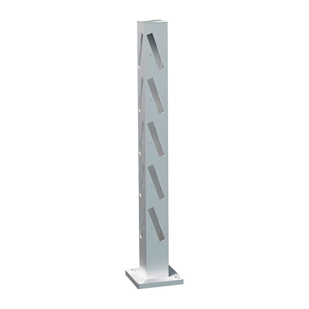 Staket med plats för regel (21X 120) i 75 graders lutning. Stolparna är tillverkade i aluminum och har en dimension om 70 x 70 mm. Godstjockleken är hela 2 mm, vilket gör stolparna både stabila och gedigna. Stolparna går att få som naturanodiserade eller lackerade i antingen vitt (RAL 9010) eller mattsvart (RAL 9005).