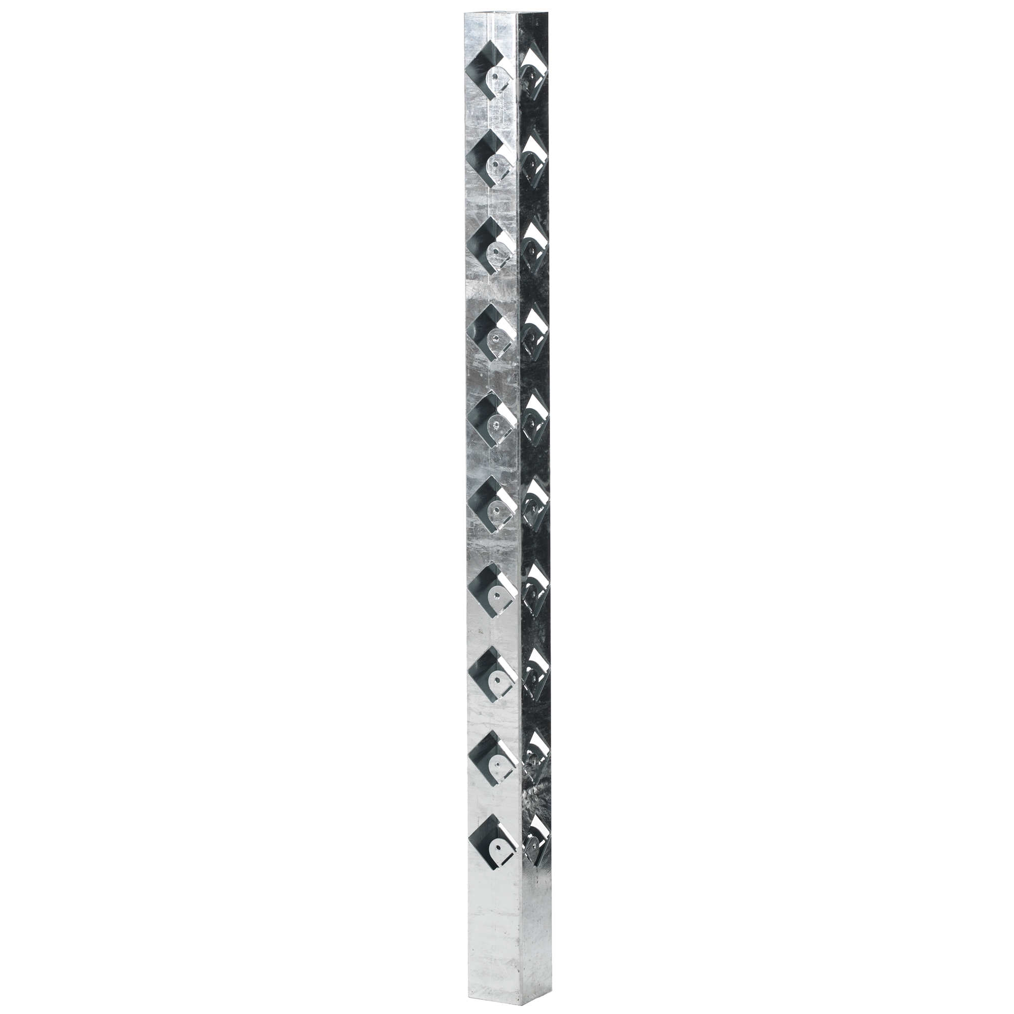 Stolparna mäter 70x70 mm och har laserskurna hål som passar 45x45 mm virke. Montera med tryckimpregnerade reglar eller måla/lasera obehandlat virke innan montering för underhållsfritt och stilrent staket i många år framöver.