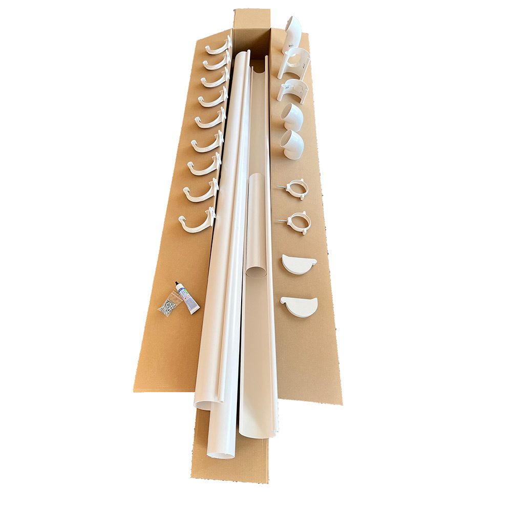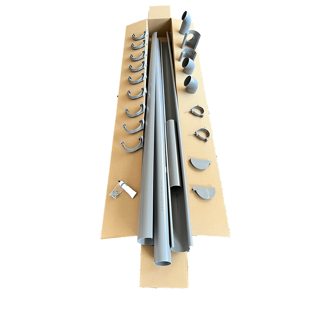 Komplett set med hänränna, stuprör och tillbehör för taklängd 4m, färg grå. Takavvattning i plast för enkelt montage, allt i ett paket.