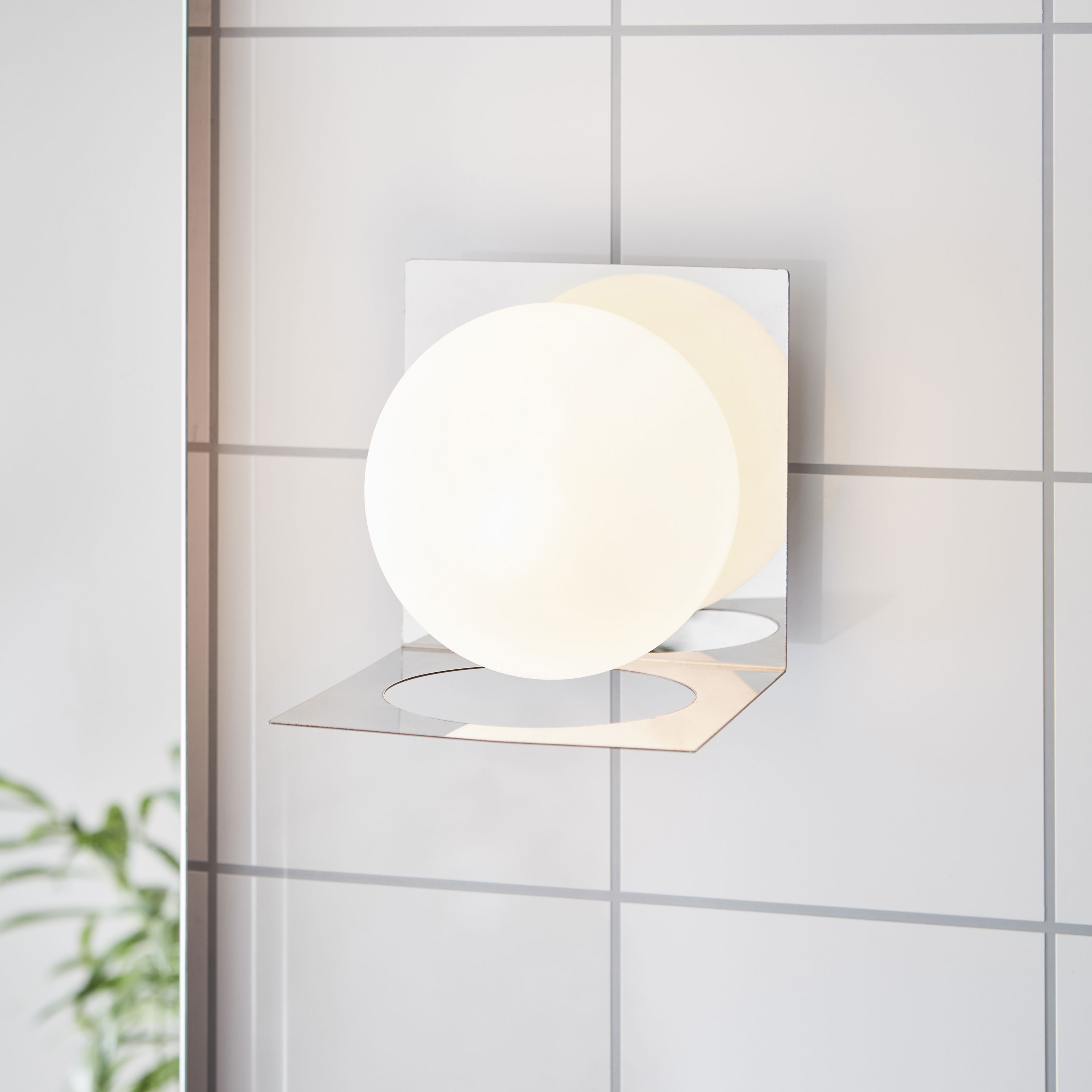 Vägglampa godkänd för badrum. Vit frostad glasglob på en bas i metall. För fast installation. För max 1x18W. G9-sockel (ingår).