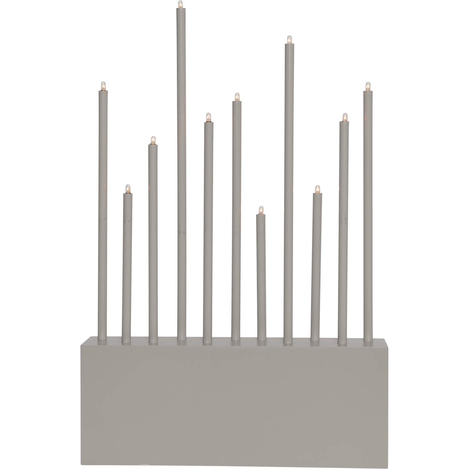 Stilren ljusstake med kraftig träbas, ljuspipor av tunna metallrör. 11st ljuskällor, E5 lampor. Textilkabel i vitt/grå. Ger ett härligt stämmnigsfullt ljus hela året runt.