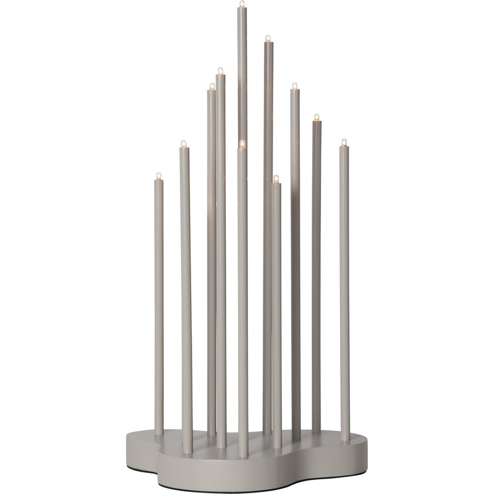Stilren ljusstake med kraftig träbas, ljuspipor av tunna metallrör. 12st ljuskällor, E5 lampor. Hela ljusstaken i vit färg. Textilkabel i vitt/grå. Ger ett härligt stämningsfullt ljus hela året runt.