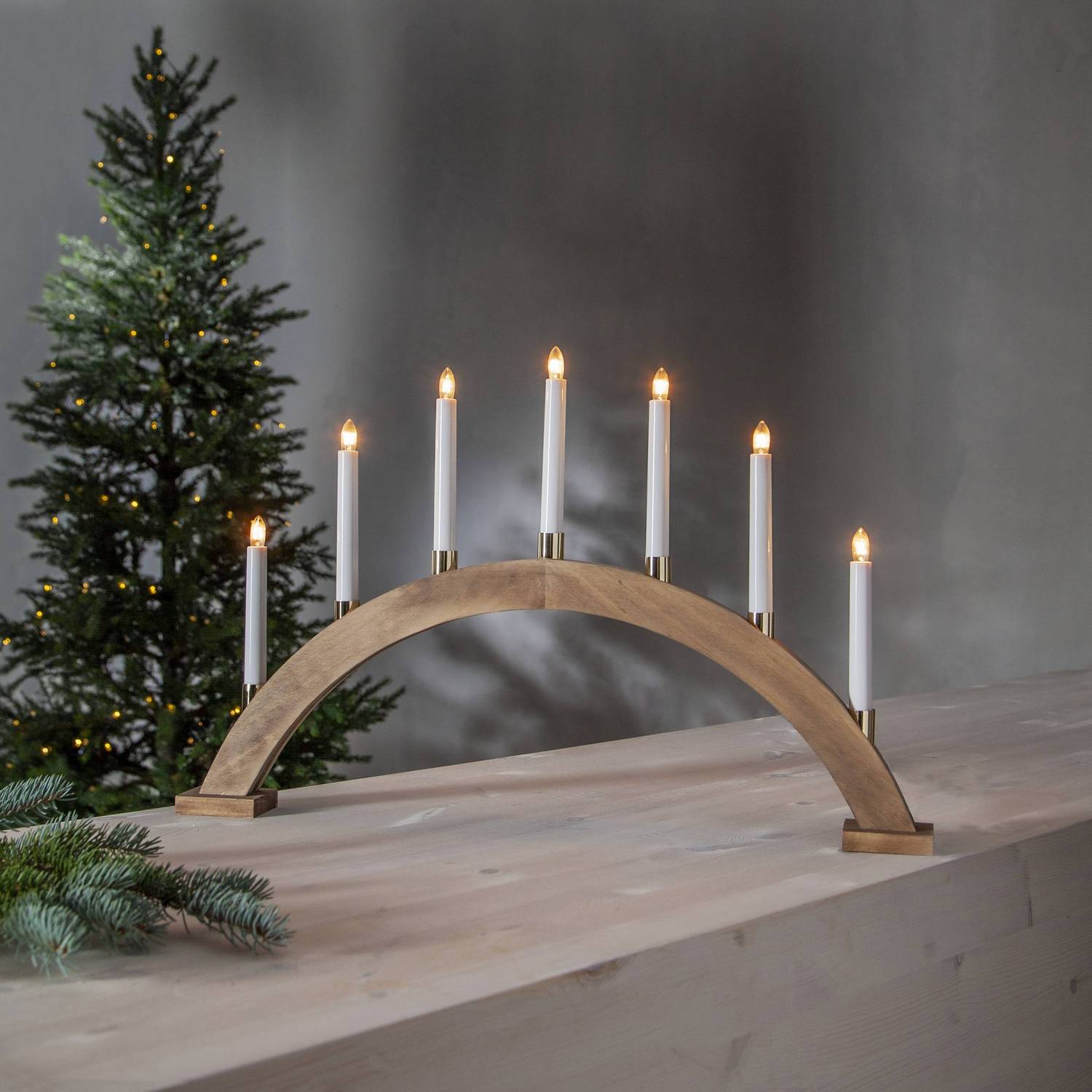 Bågformad träljusstake med mässingbelagda ljushållare. Fin adventsljusstake att dekorera med till jul. Ljusstaken har 7 stycken ljuskällor.