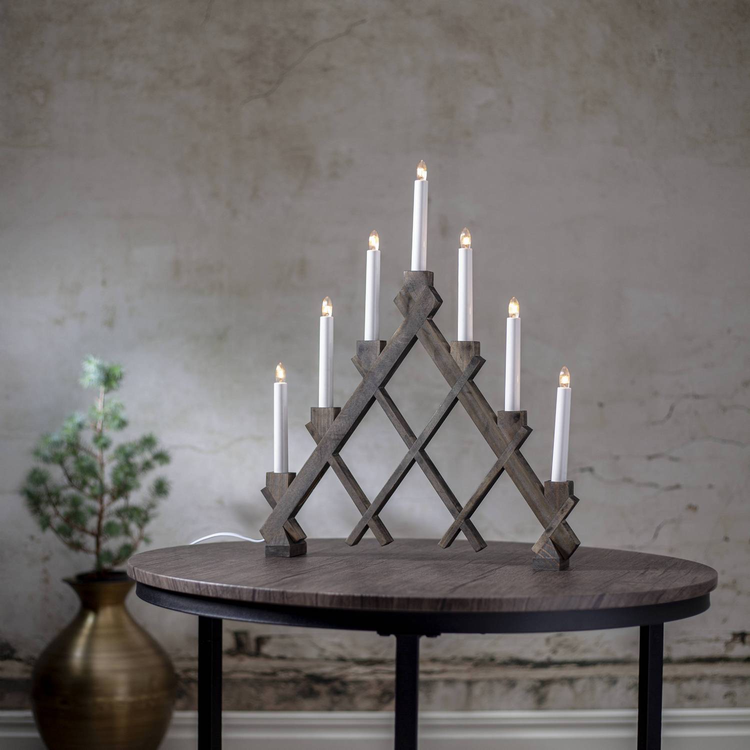 Vacker brun betsad träljusstake. Betsfärgen förekommer i både ljusa och mörka toner. Ljusstakens vackra rut-mönster är iögonfallande. Med sina 7 ljuskällor skapar den en mysig belysning.Denna produkt har FSC®-märkning.