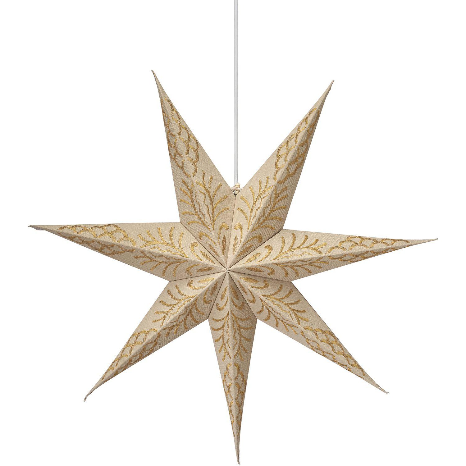 Julstjärna i papper av en lite kraftigare kvalitet med brodyr i kontrastfärg. Stjärnan stängs med hjälp av band och en dragsko. Köp till E14-sladdställ och ljuskälla, max 25W.