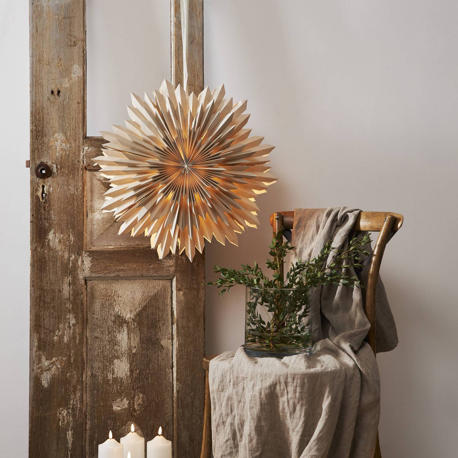 Fantastisk vit pappersstjärna som är tillverkad av tre lager veckat papper. Konturen är lite ojämn för en vintrigare känsla. Ett elegant band ingår för att lättare kunna hänga upp stjärnan. Stjärnan sprider stämning och ger hemmet den där speciella julkänslan. Kan hängas både i förnster och mot en vägg. Denna produkt har FSC®-märkning.