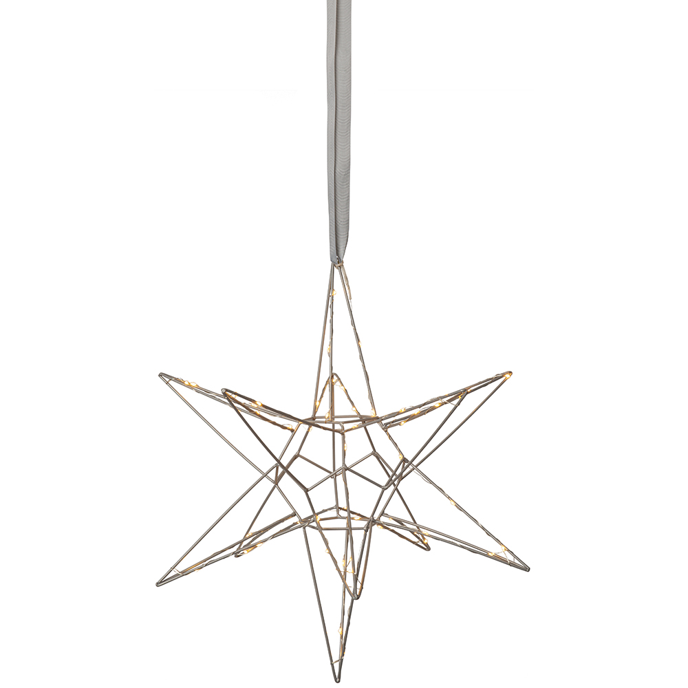 Vacker 3D stjärna i metall för inomhusbruk. Stjärnan har 60 LED-ljuskällor med varmvitt sken. Fin dekoration att hänga eller placera på en skänk. Dekorera till advent och jul för en magisk julkänsla.