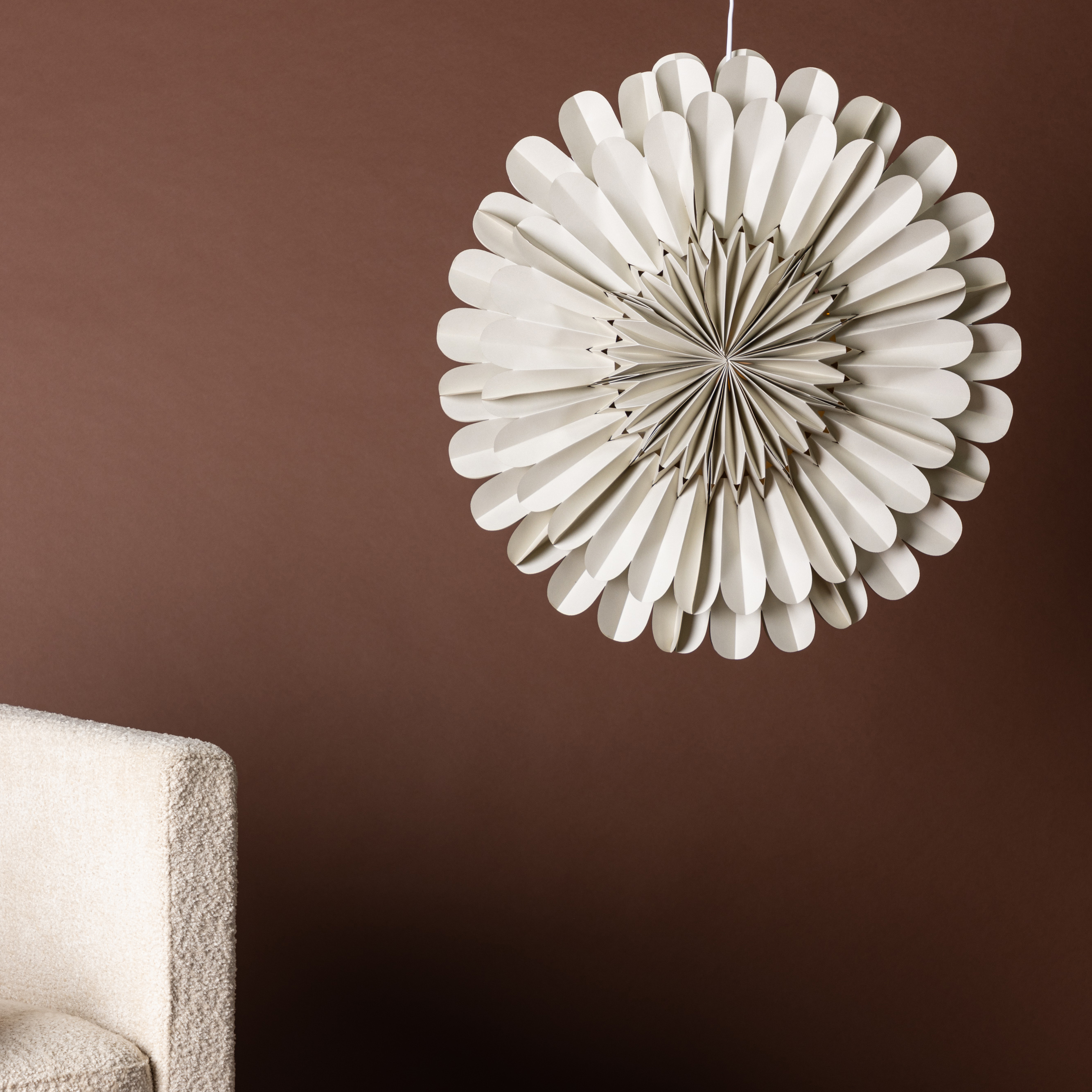 Lampan hänger i en vit sladd som diskret smälter in mot väggen och ger ett stilrent uttryck, så att fokus verkligen hamnar på den underbara stjärnan. Oavsett om det är under höstens mörka dagar eller under julens högtidliga stämning, kommer pappersstjärnan Järvsön att skapa en underbar atmosfär som får dig att känna dig omfamnad av värme och lugn.
