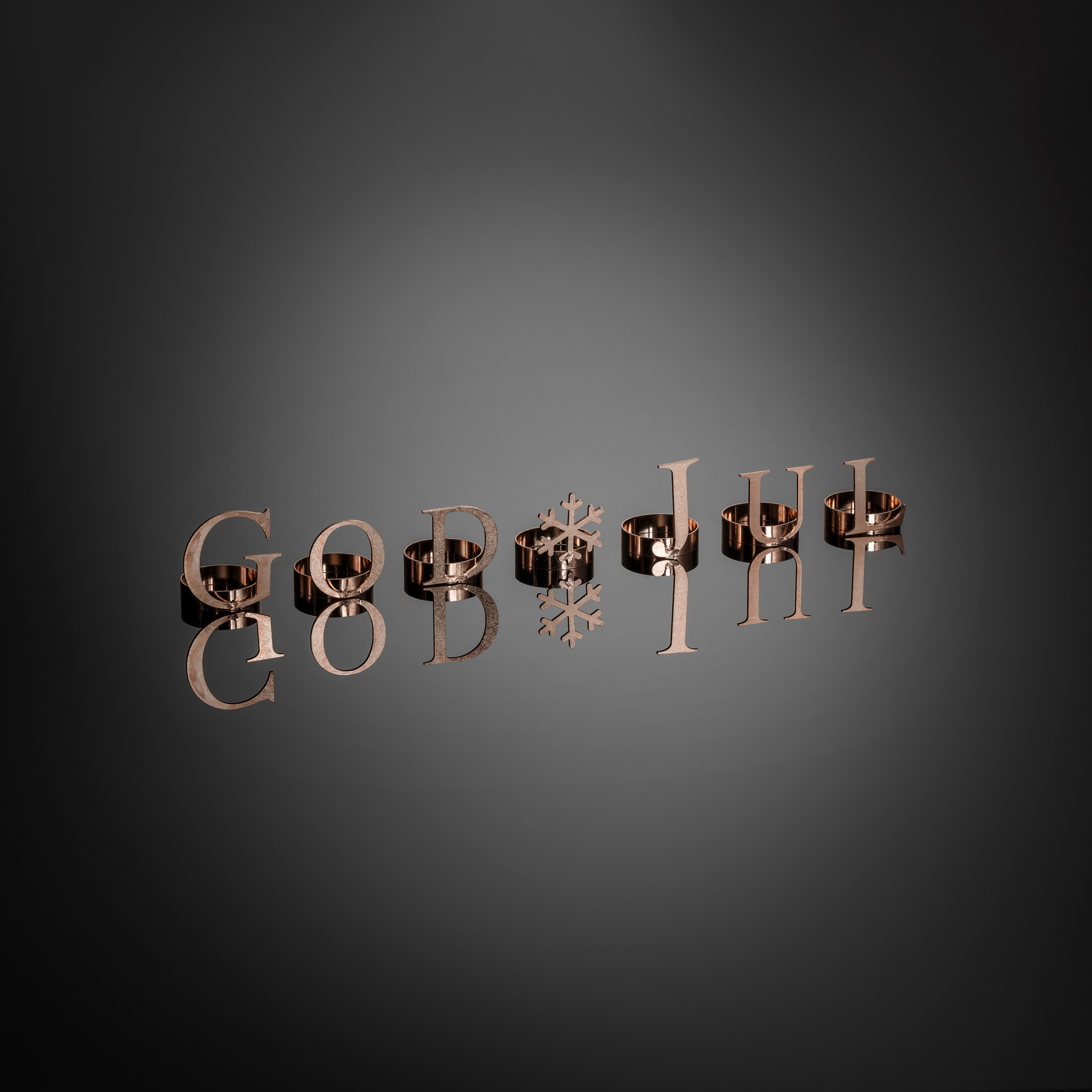 Sju st dekorationsbokstäver från Gnosjö Konstsmide som bildar "God Jul".