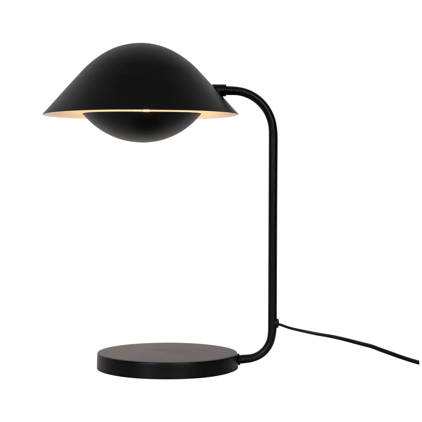 Freya är en serie med organiskt formade lampor i nordisk samtida design. Den nästan överdimensionerade toppskärmen omfamnar den nedre skärmen och kompletterar den eleganta siluetten – samtidigt som den täcker ljuskällan för att ge ett behagligt ljus.