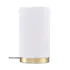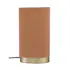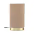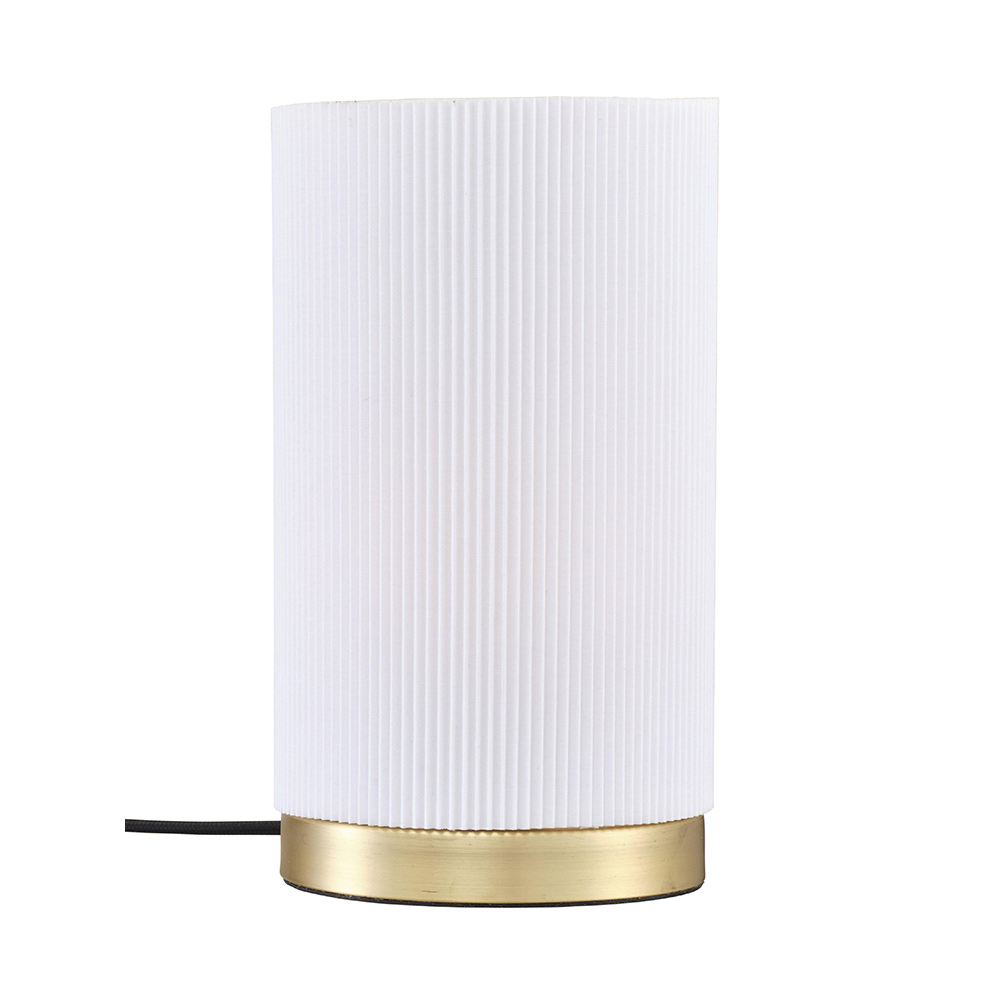 Stilren bordslampa med fastmonterad lampskärm som är gjord i veckat material av polyester och bomull. Laminatet på skärmens baksida är av polystyren plast. Bottenplattan är gjord i metall och lackerad i mattguld färg.