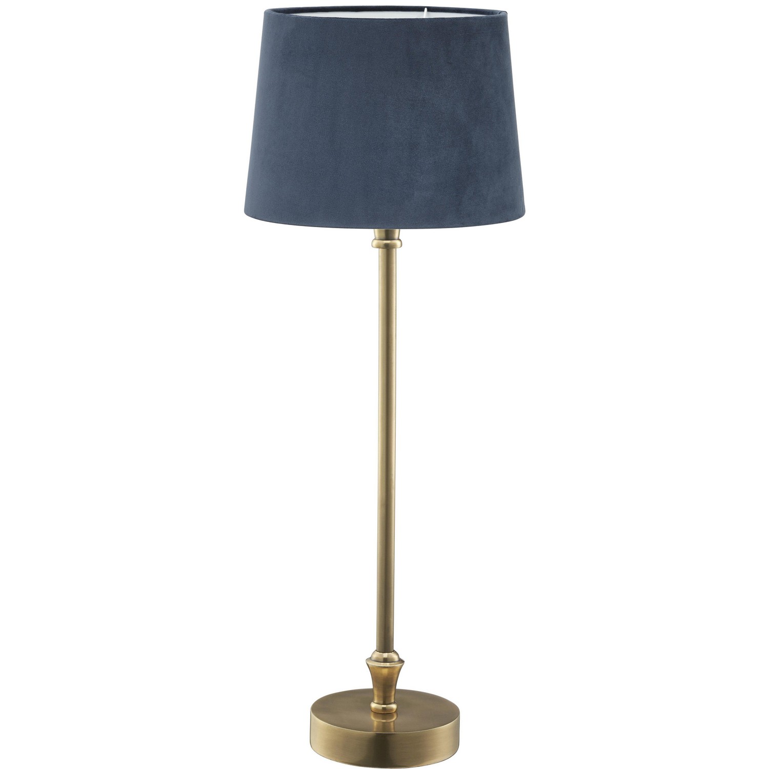 Bordslampa PR Home Liam med Sofia Lampskärm är en lampfot och lampskärmen Sofia i blå sammet. Skärmen är 20 cm bred och 15,5 cm hög och har ett E27-ringfäste. Lampfoten är 46 cm hög och den totala höjden blir 59 cm. E27-sockel. Max 40W. Ljuskälla köpes separat.