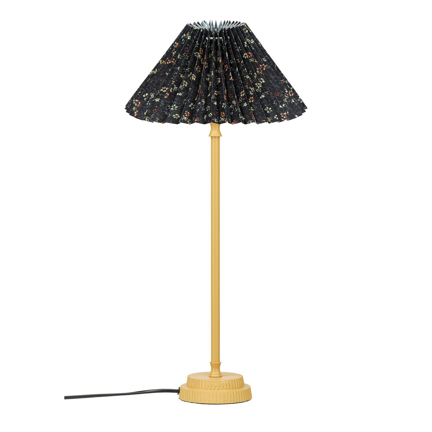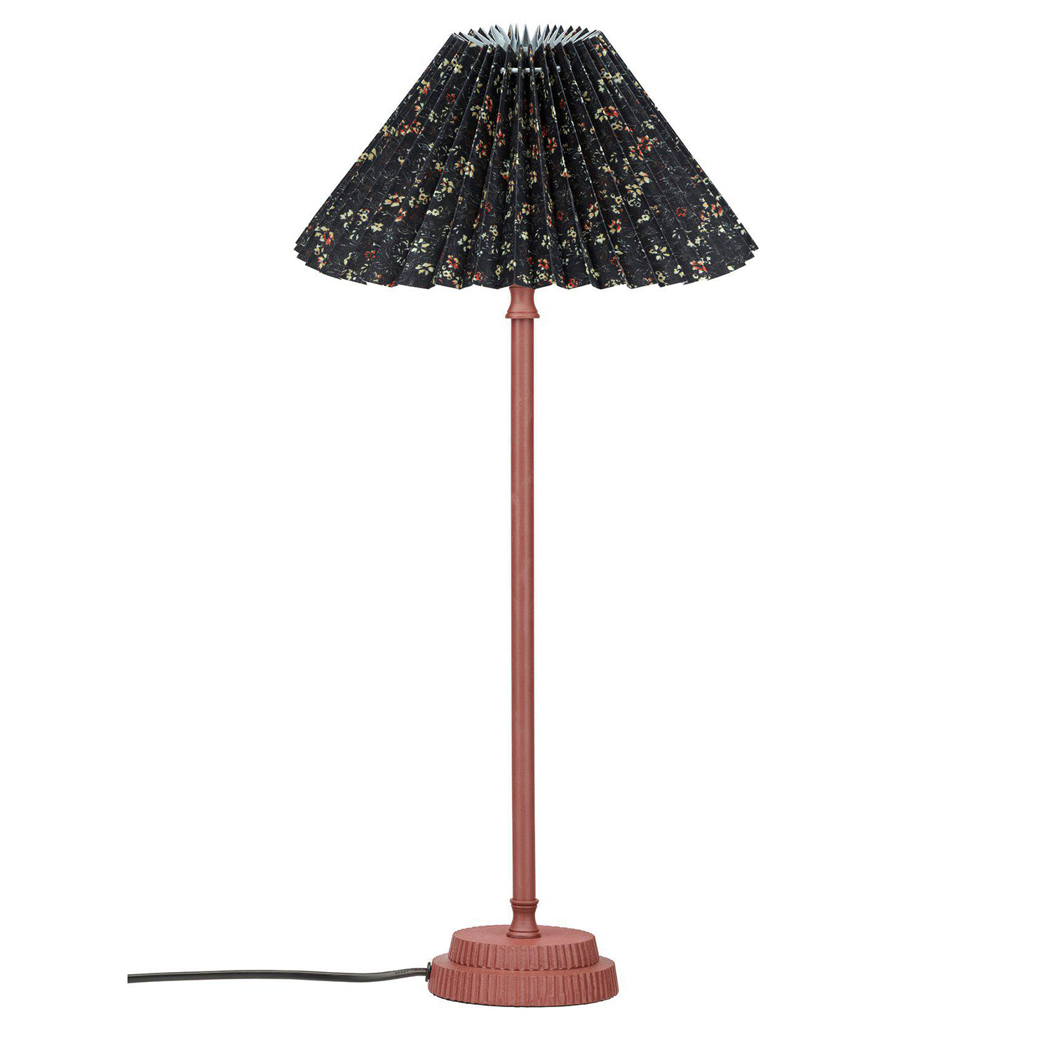 Kent lampfot med den veckade lampskärmen Ines i ett småblommigt ekologiskt bomullstyg. Skärmen är 25 cm bred och 14cm hög och har ett vändbart E27 ringfäste. Lampfoten är 45cm hög och den totala höjden blir 55 cm. 1,5 m svart plastsladd med strömbrytare. E27 sockel. Max 40W. IP20. Ljuskälla köpes separat.