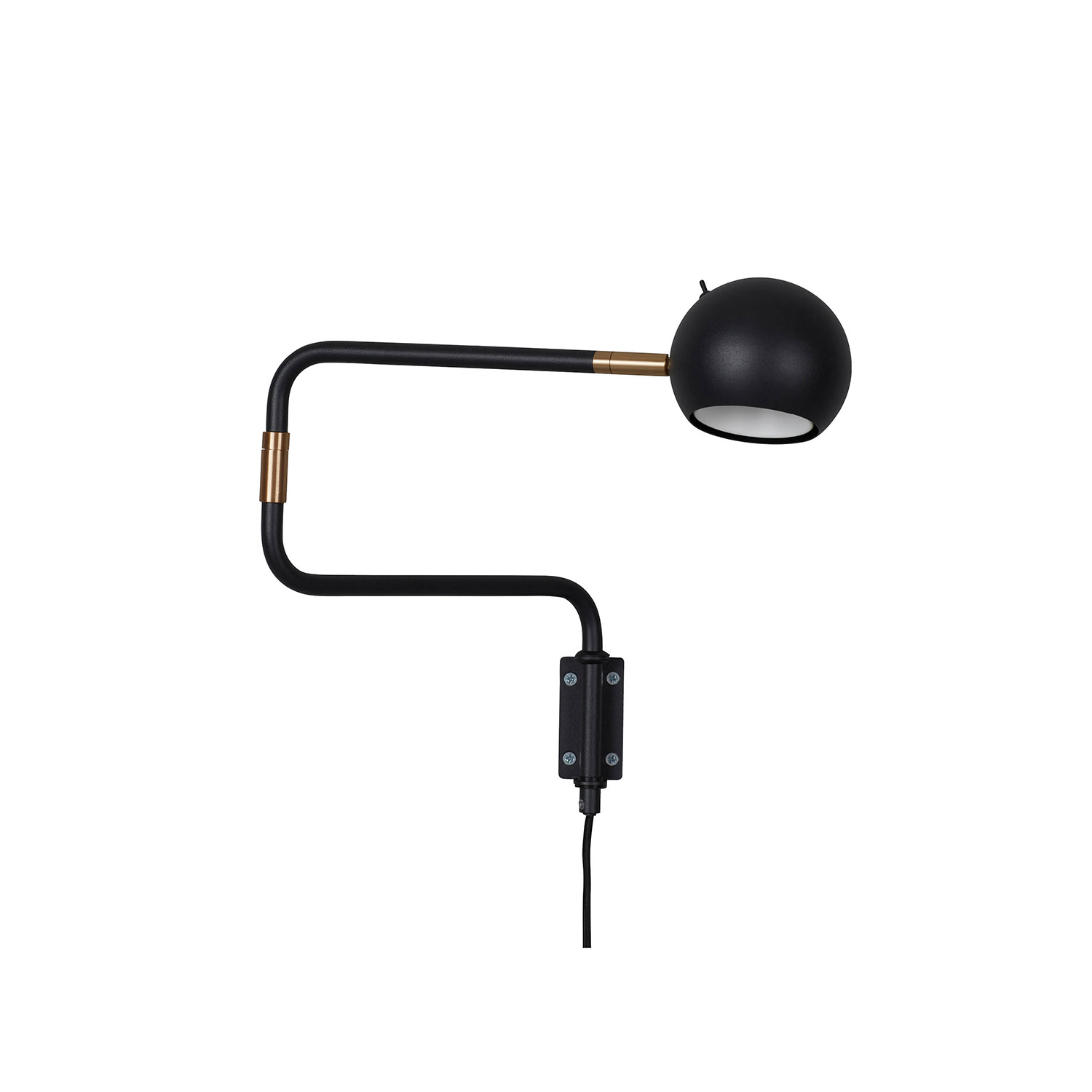 Lampan är tillverkad av metall med en matt finish och dekorativa mässingfärgade detaljer. Den riktbara skärmen har en vit insida, vilket ger ett bra och funktionellt ljus. Lampans arm är dessutom svängbar i två leder, vilket ger stor möjlighet att justera och vrida ljuset dit det önskas.