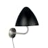 Modern vägglampa med stilren metallskärm i borstat stål som kan vinklas och vridas. Strömbrytare sitter på basen och sladden är avtagbar.