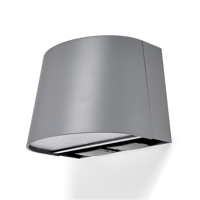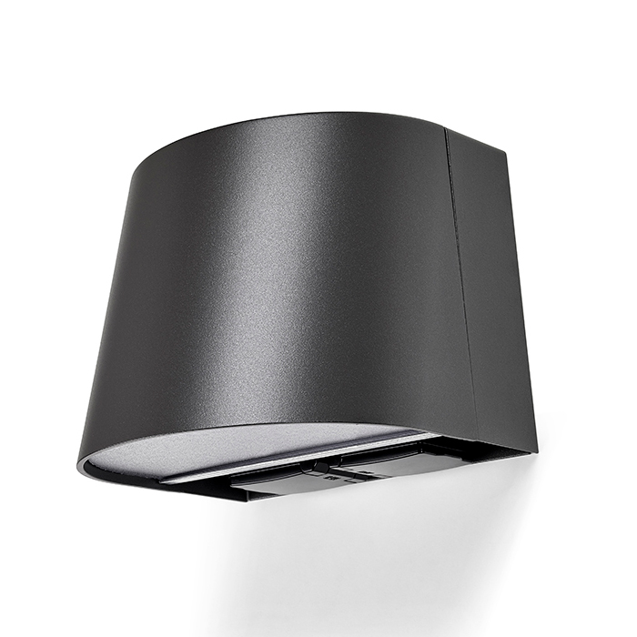 Väggarmatur med två jordade uttag. Anodiserad och pulverlackerad stomme i aluminium, bländskydd i PET-G. Armaturen är bestyckad med LED-enheten Philips Fortimo Disk 800lm, 3000K med ett avbländat nedljus. Bakstycket har två in- och utgångar samt snabbkopplingsplint. Avsedd för utomhusbruk (IP44) och passar för bruk både i privat och offentlig miljö.