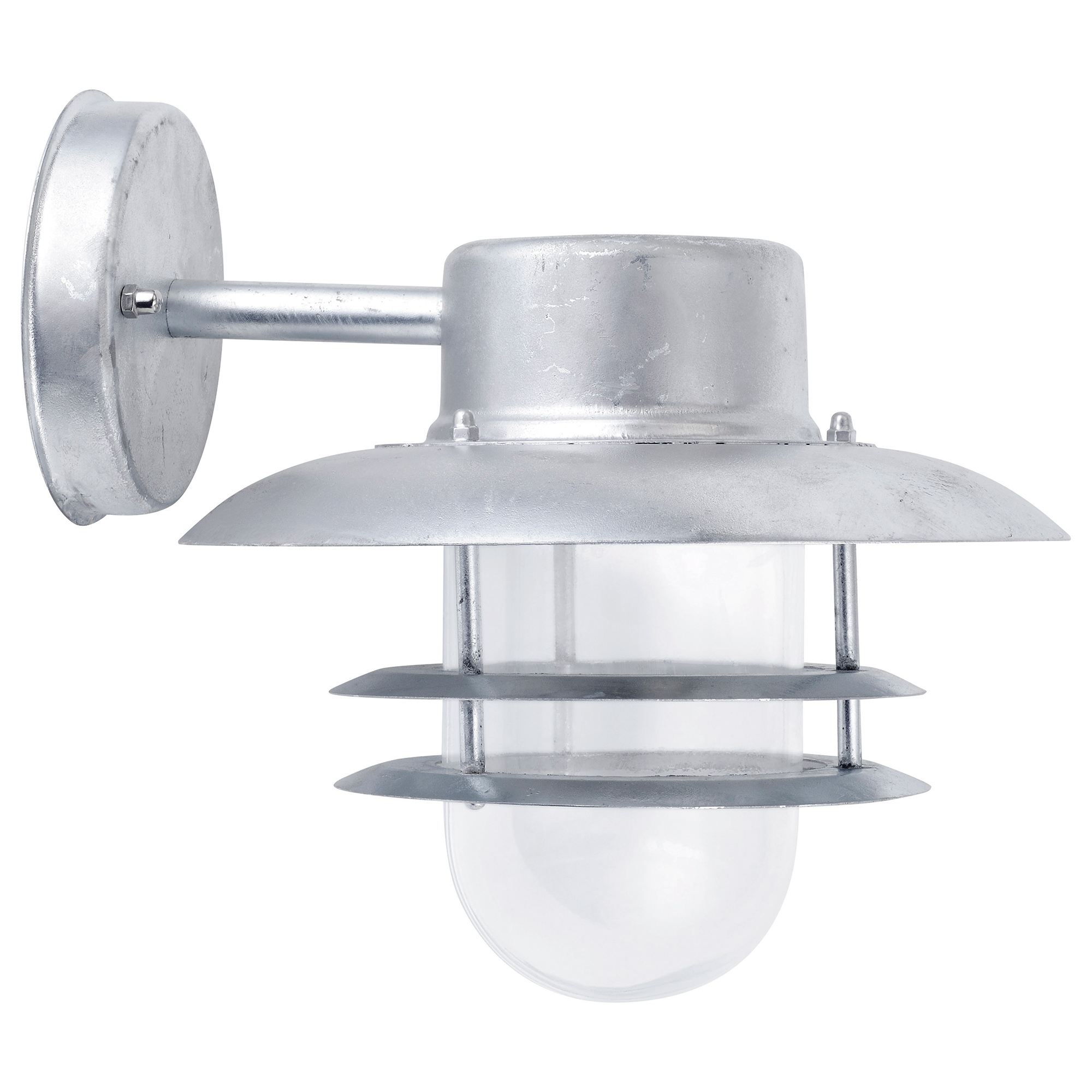 Vägglampa från Malmbergs. Stomme av stålplåt och kupa av glas. Anslutes till plint 3x1,5 mm².