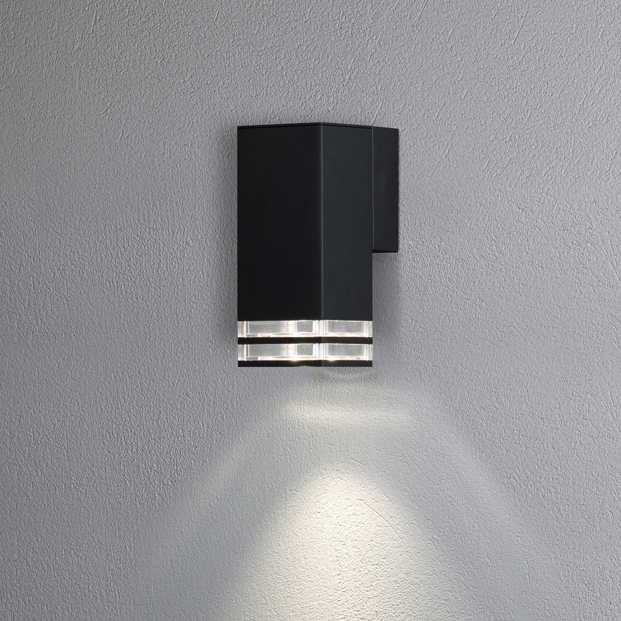 Vägglykta Gnosjö Konstsmide Pollux Ned Dubbel 2xGU10 är en stilren fasadbelysning som lyser neråt på väggen. Den levereras utan ljuskälla.