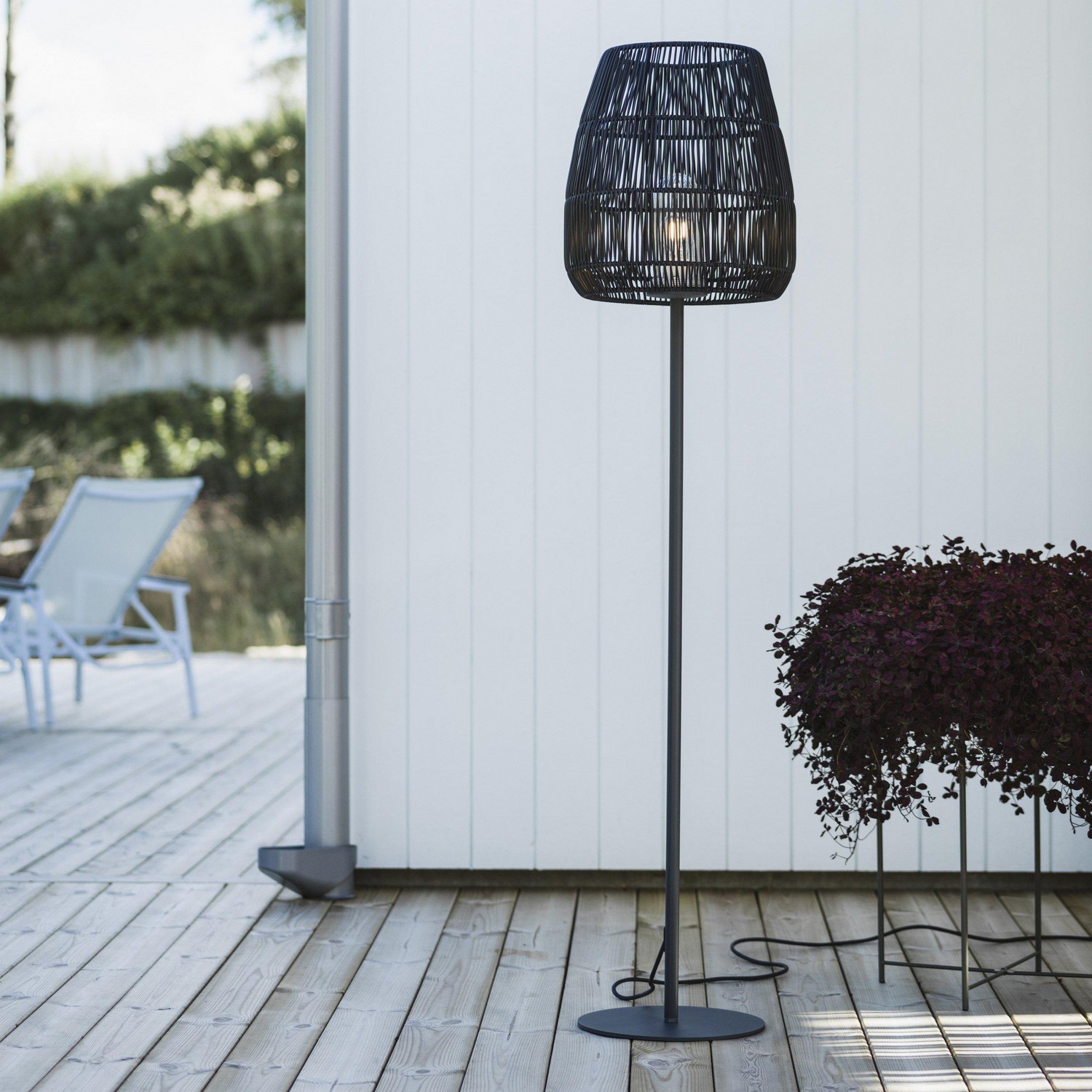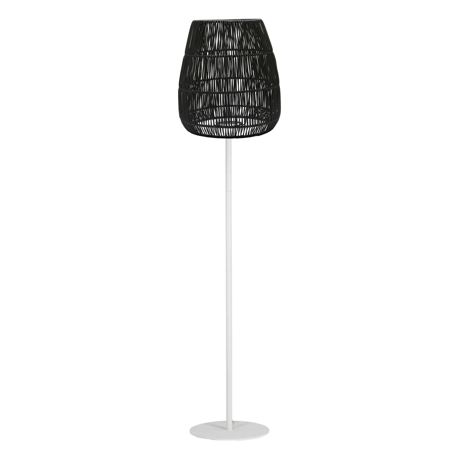Lampskärmen har en flätad struktur som skapar ett vackert ljusspel, och är tillverkad i konstrotting som är ett vädertåligt material. Skärmen sätts fast i lampfoten med hjälp av ett specialfäste. Kabellängd 200 cm.