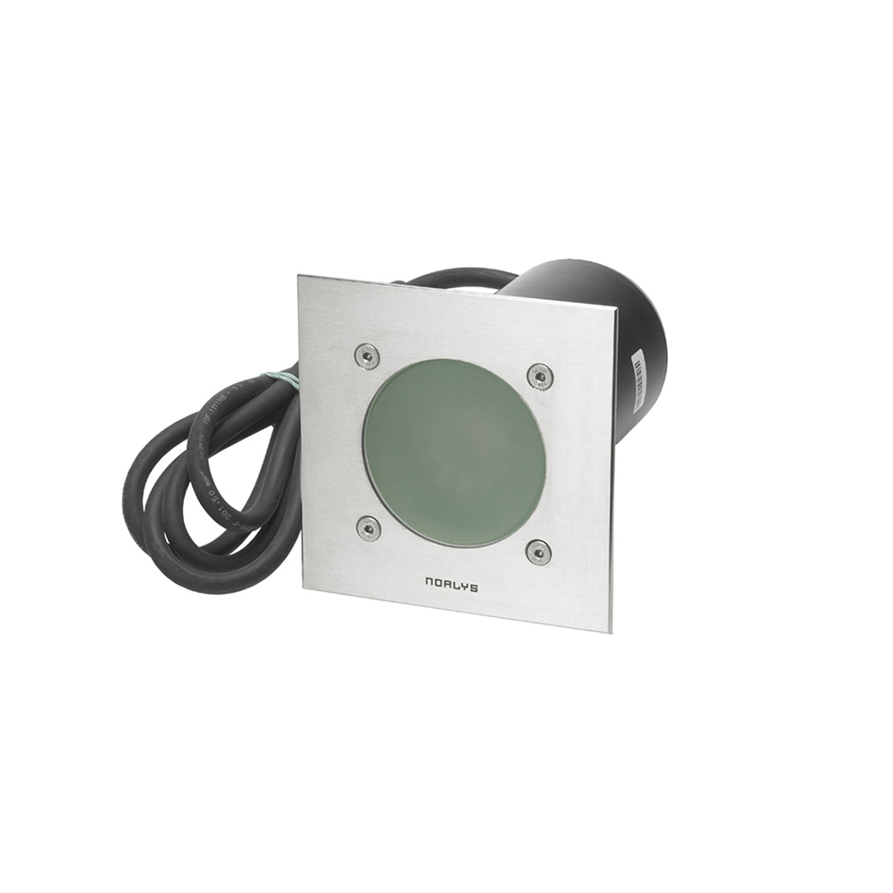 Markarmatur. Front i rostfritt stål. Klart glas. Armaturhus i aluminium. 10mm härdat glas. Fyrkantig modell. 3 meter färdigmonterad kabel medföljer. Infällningsbox i polypropylen för nedgrävning/ingjutning medföljer.