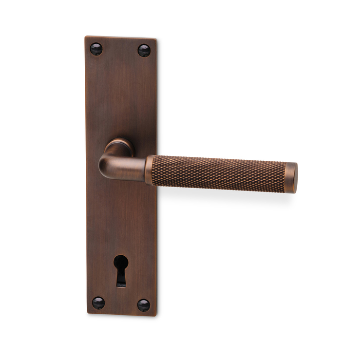 Dörrhandtag av mässing med långskylt. En exklusiv modell med robust industriell karaktär. Passar för dörrtjocklek på 38-42 mm med ett utsprång på 55 mm.