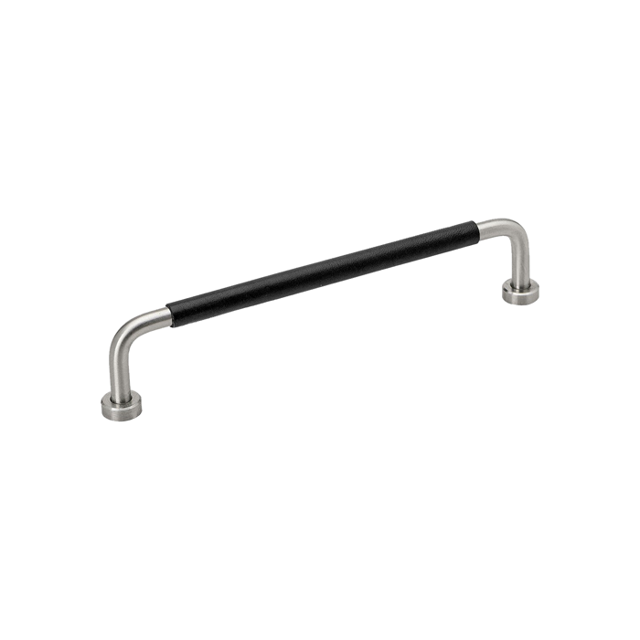 Handtag från Beslag Design i metall. Enkel och tidlös design som fungerar på både luckor och lådor. Läderlindat för behagligt och stadigt grepp.