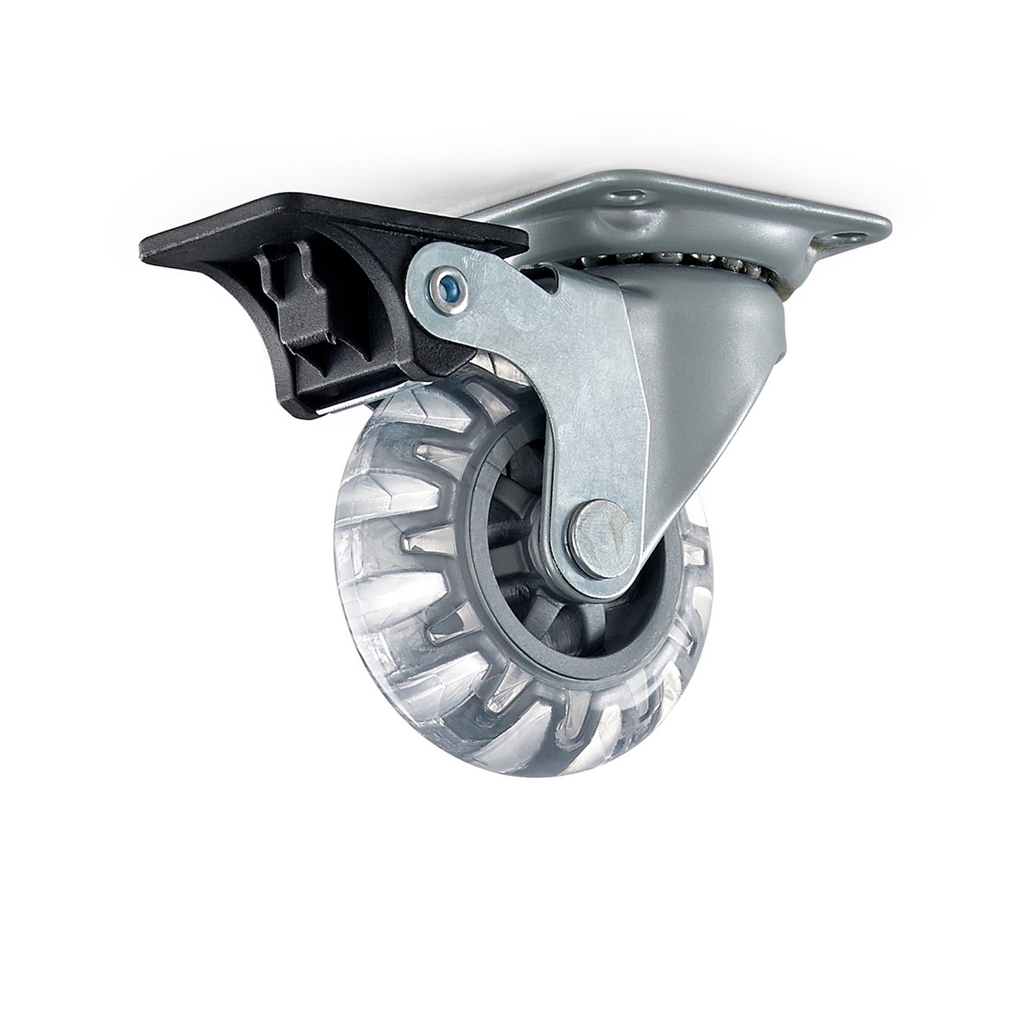 Svängbart möbelhjul av stål med platta och hjulbroms. Hjul Ø75 mm av transparent polyuretan (PUR). Fästplatta 60x60 mm. Maxbelastning 55 kg per hjul (beräknat värde, garanteras inte).