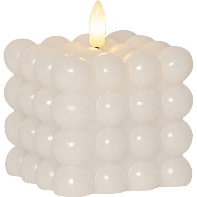 Flamme Dot är ett fyrkantigt ljus gjord av vit vax med en bubblig yta. Ljuset är cirka 8,5x9,5 cm inklusive lågan.