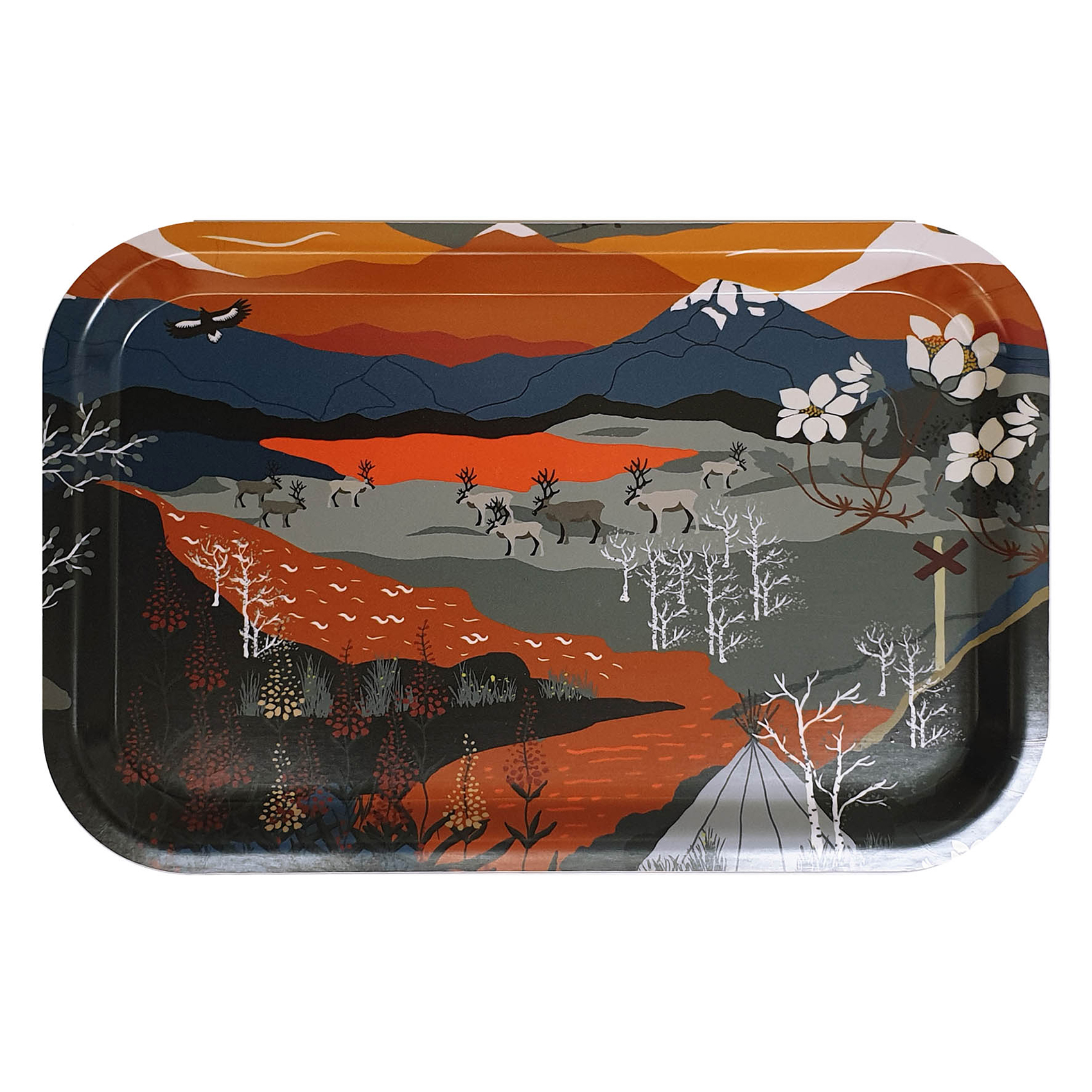 Bricka Fjällvandring från Arvidssons Textil. Svenskdesignat mönster med motiv av härliga fjällandskap med renar och solnedgången. Tillverkad i Sverige. Design av Louise Videlyck.