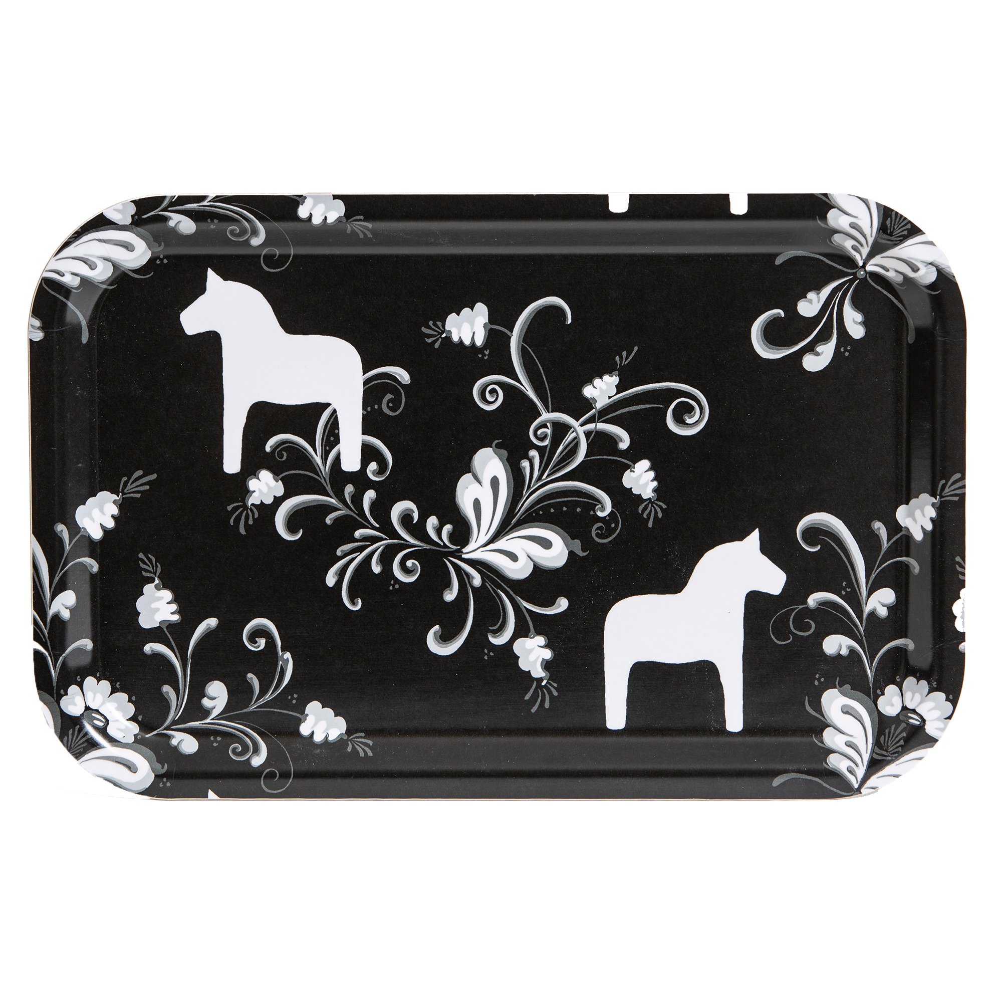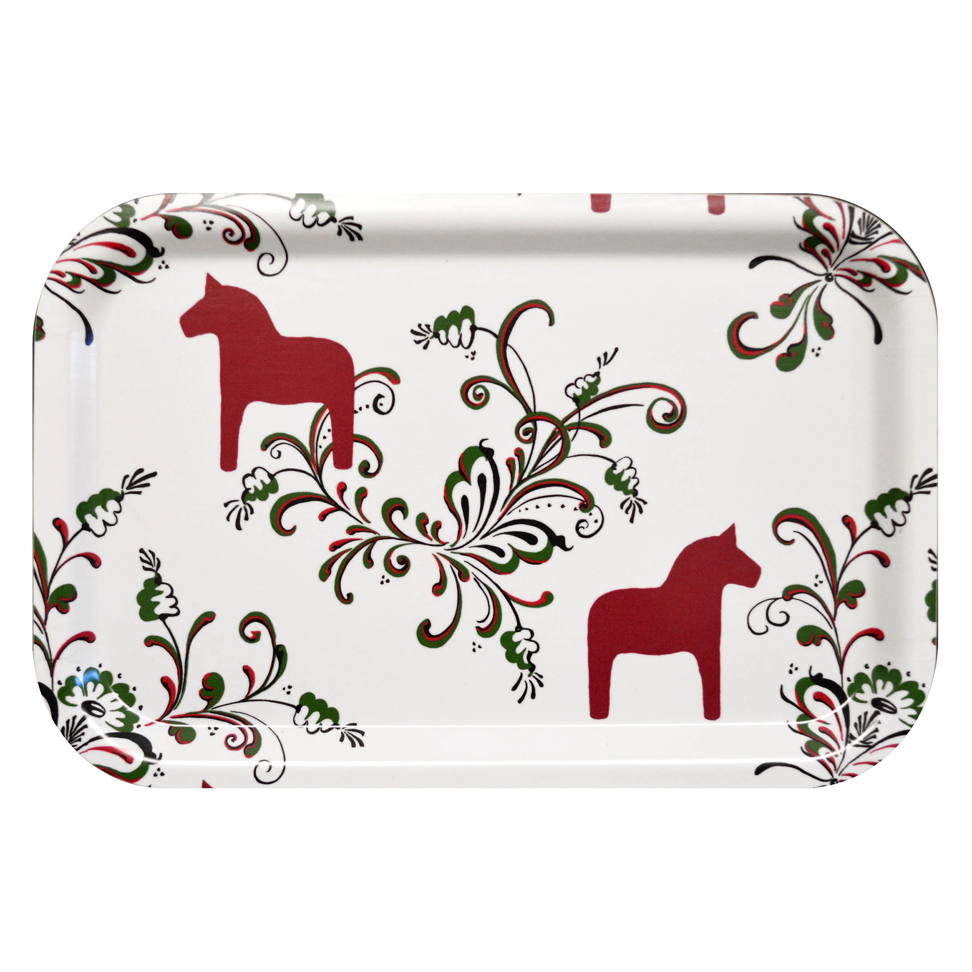 Bricka från Arvidssons Textil. Svenskdesignat mönster med dalahästar och kurbitsmotiv. Tillverkad i Sverige.