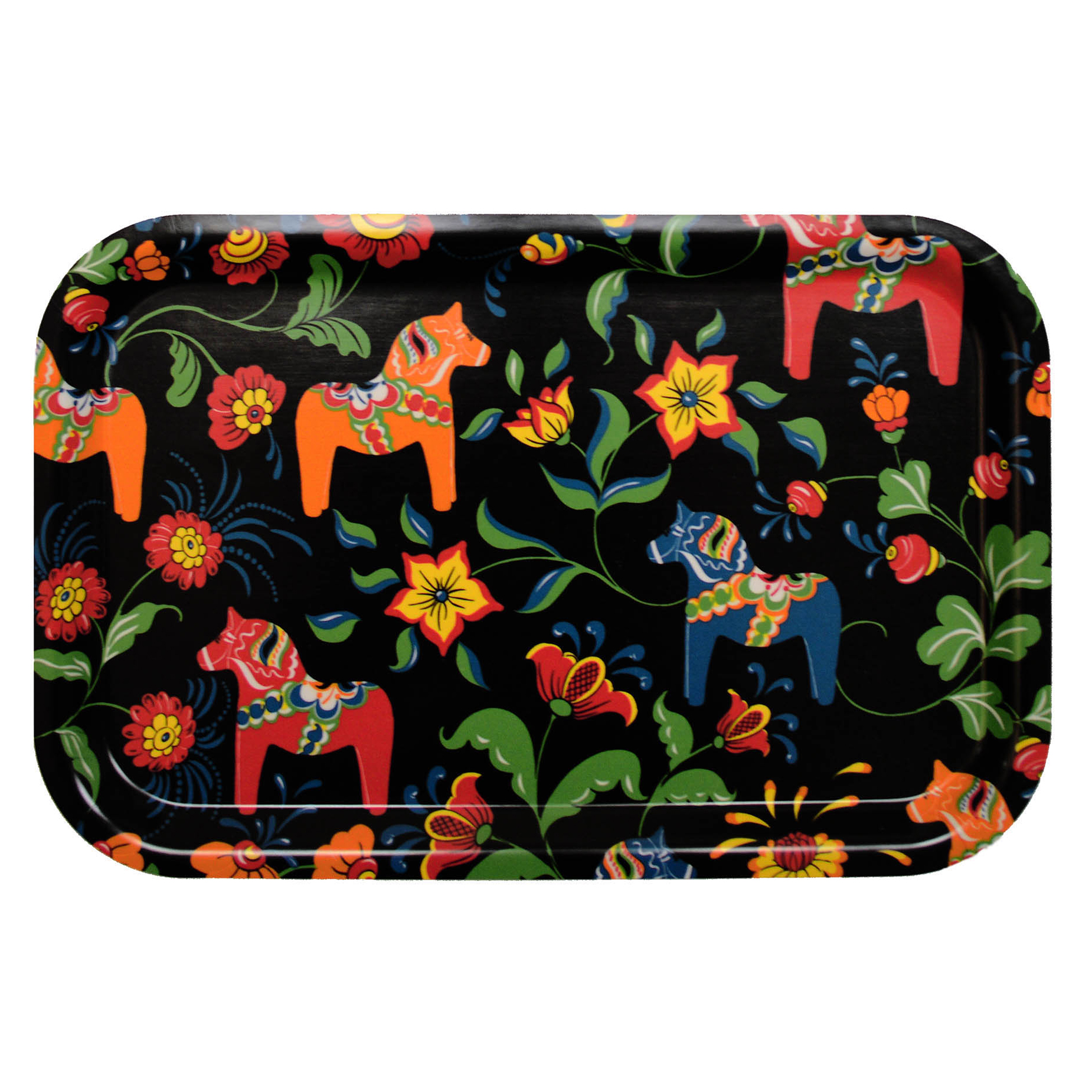 Bricka Leksand från Arvidssons Textil. Svenskdesignat mönster av Carola Bengtsson-Malmström. Med dalahästar och kurbitsmotiv i glada färger. Tillverkad i Sverige.