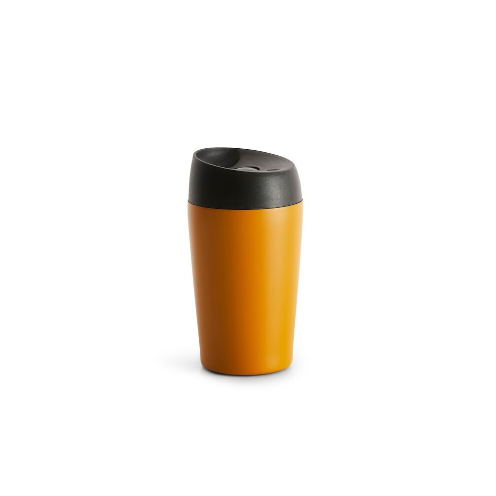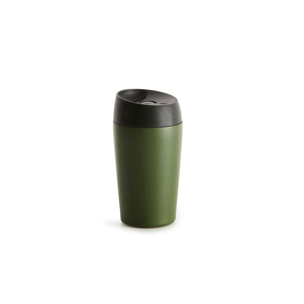 Den smarta låsfunktionen gör muggen både läckagefri och lätt att dricka ur. Bara att trycka på knappen för att öppna/stänga. Muggen har en dubbelväggig konstruktion i rostfritt stål vilket gör att den håller värme längre. Gör ett hållbart val och undvik engångsmuggar.