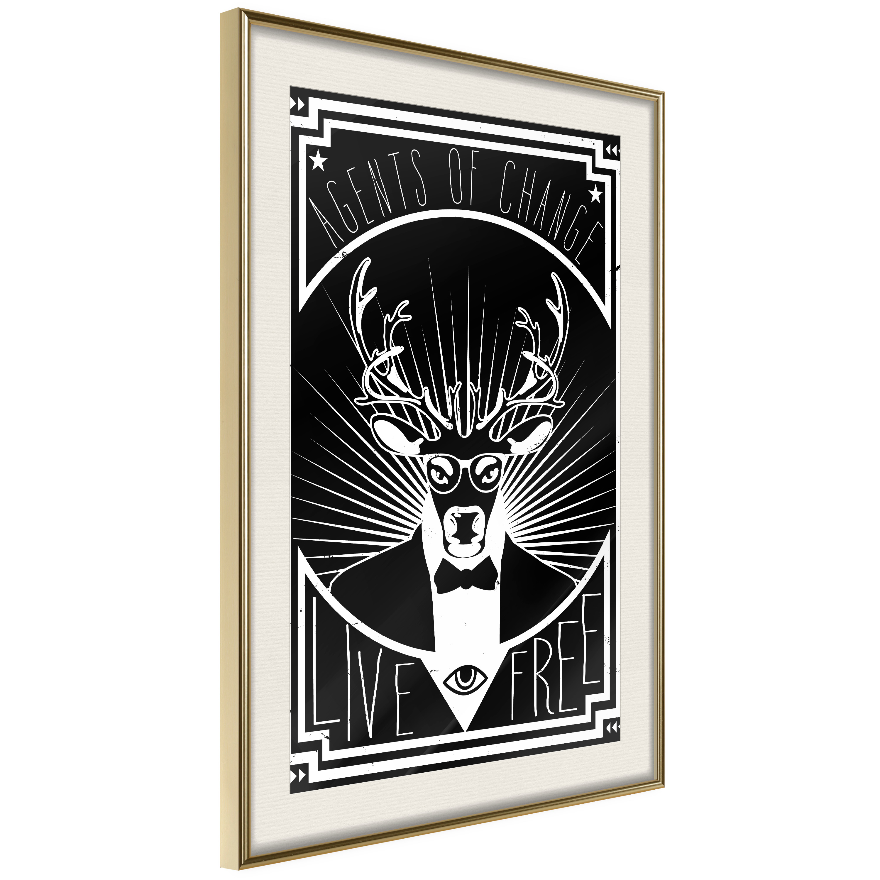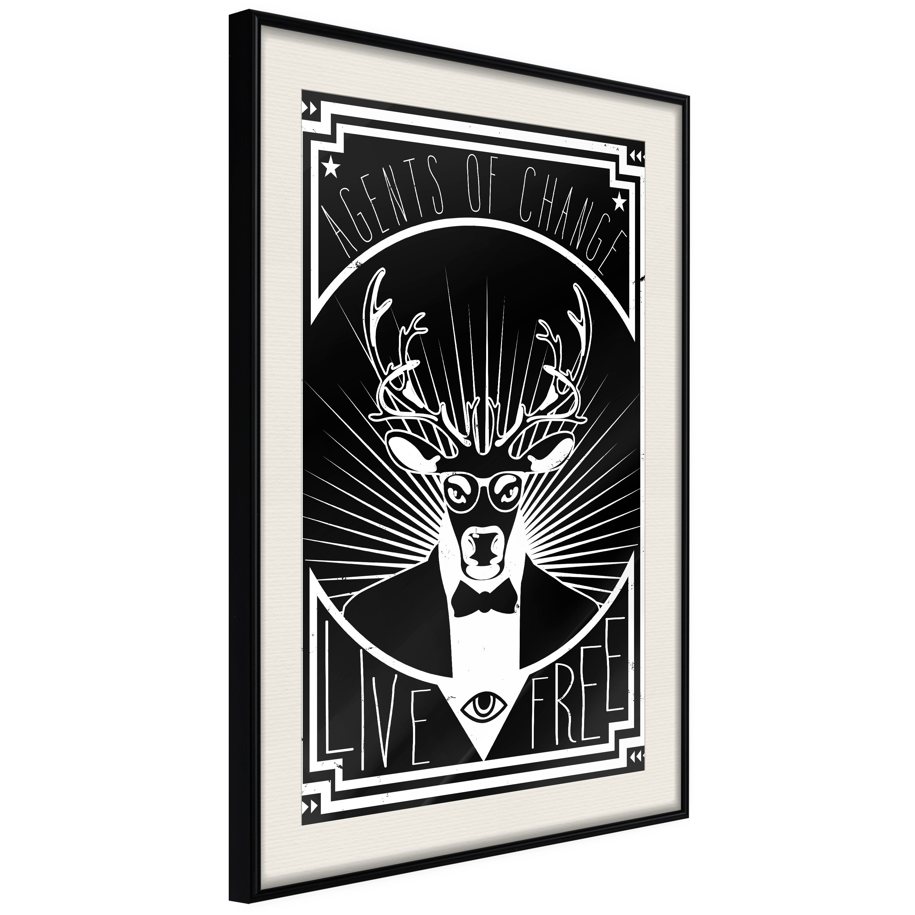 Passepartouten i écru betonar färgern på affischen och skapar en extra kontrast mellan grafiken, ramen och väggen. Dessutom ger den ramen ett svagt tredimensionellt intryck och fungerar även som ett skyddslager som ytterligare skyddar afischen. Affischen är säkrad med akrylglas och en hänganordning finns på ramens baksida.