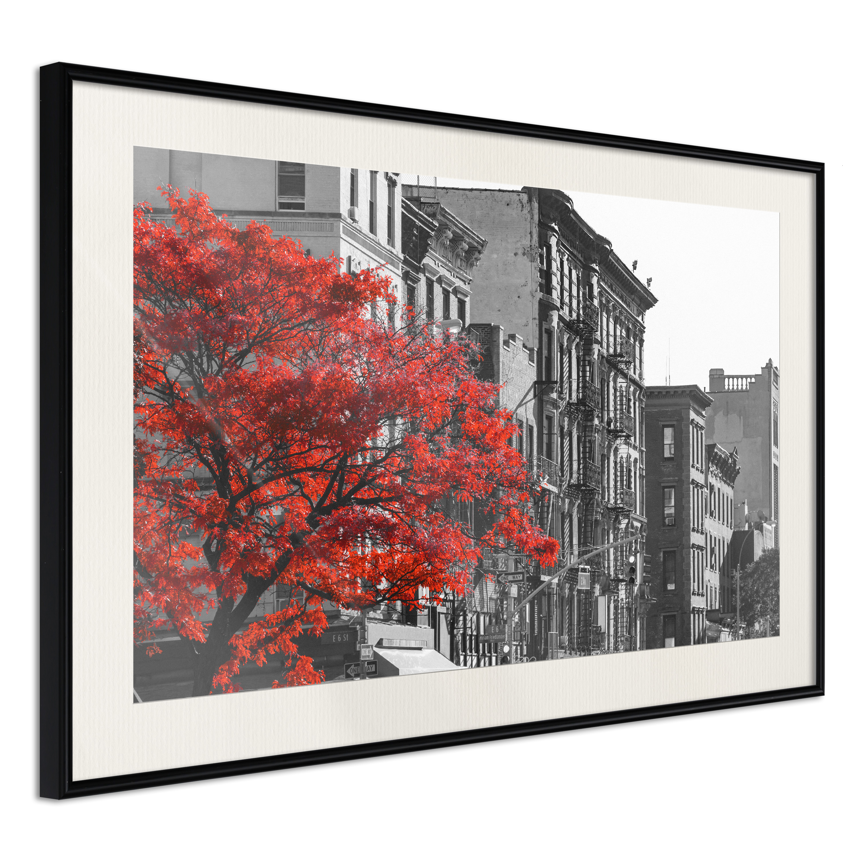 Passepartouten i écru betonar färgern på affischen och skapar en extra kontrast mellan grafiken, ramen och väggen. Dessutom ger den ramen ett svagt tredimensionellt intryck och fungerar även som ett skyddslager som ytterligare skyddar afischen. Affischen är säkrad med akrylglas och en hänganordning finns på ramens baksida.