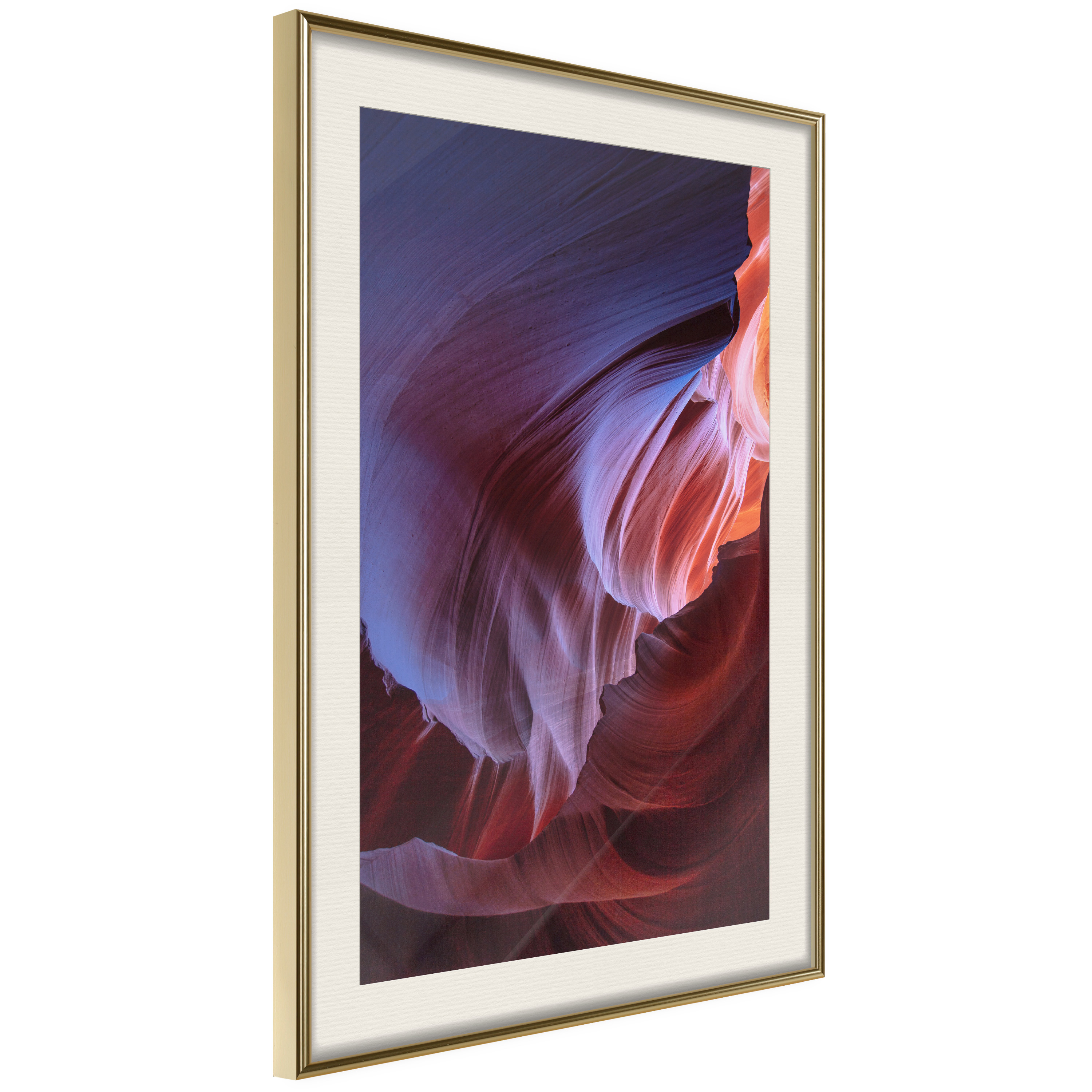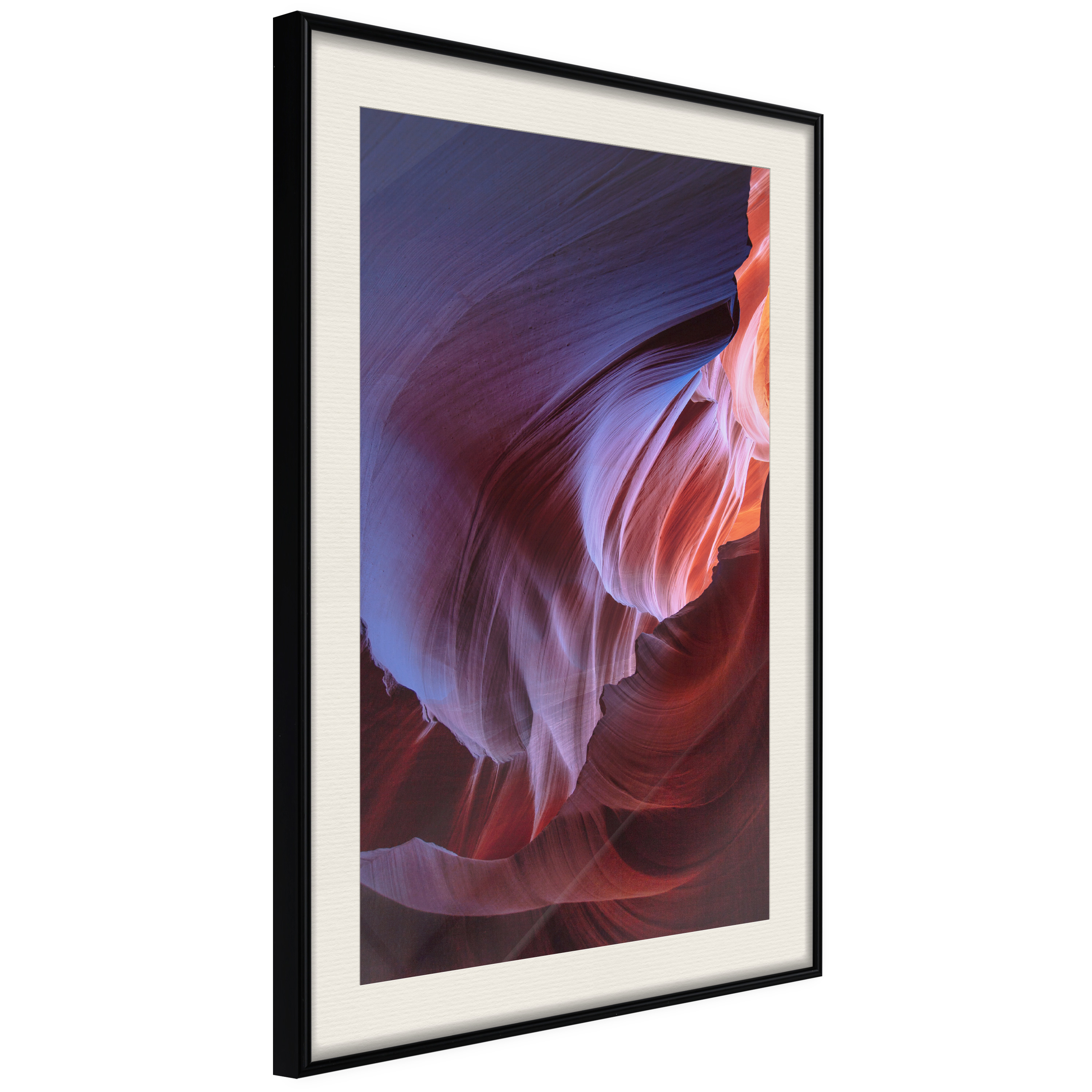 Passepartouten i écru betonar färgern på affischen och skapar en extra kontrast mellan grafiken, ramen och väggen. Dessutom ger den ramen ett svagt tredimensionellt intryck och fungerar även som ett skyddslager som ytterligare skyddar afischen. Affischen är säkrad med akrylglas och en hänganordning finns på ramens baksida.