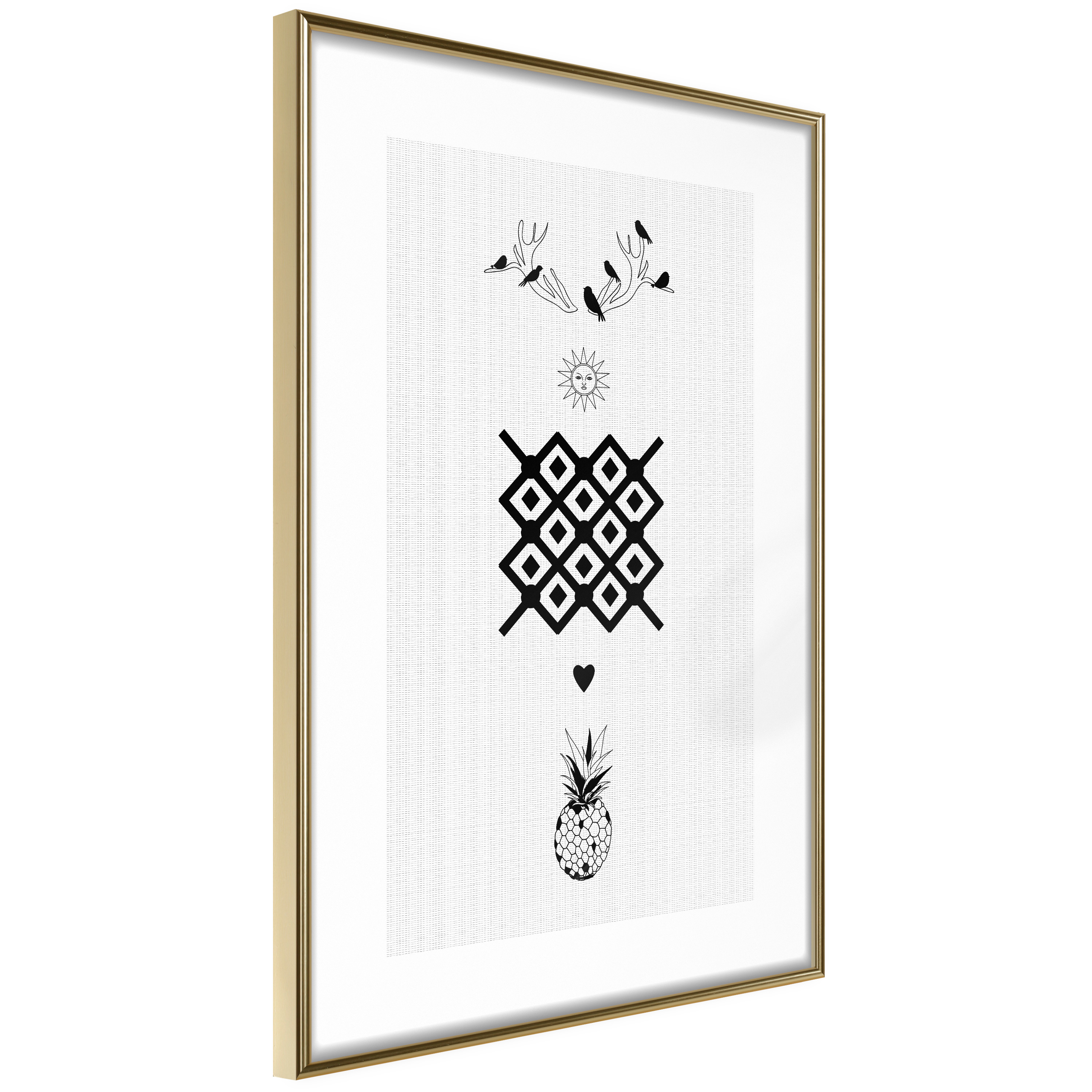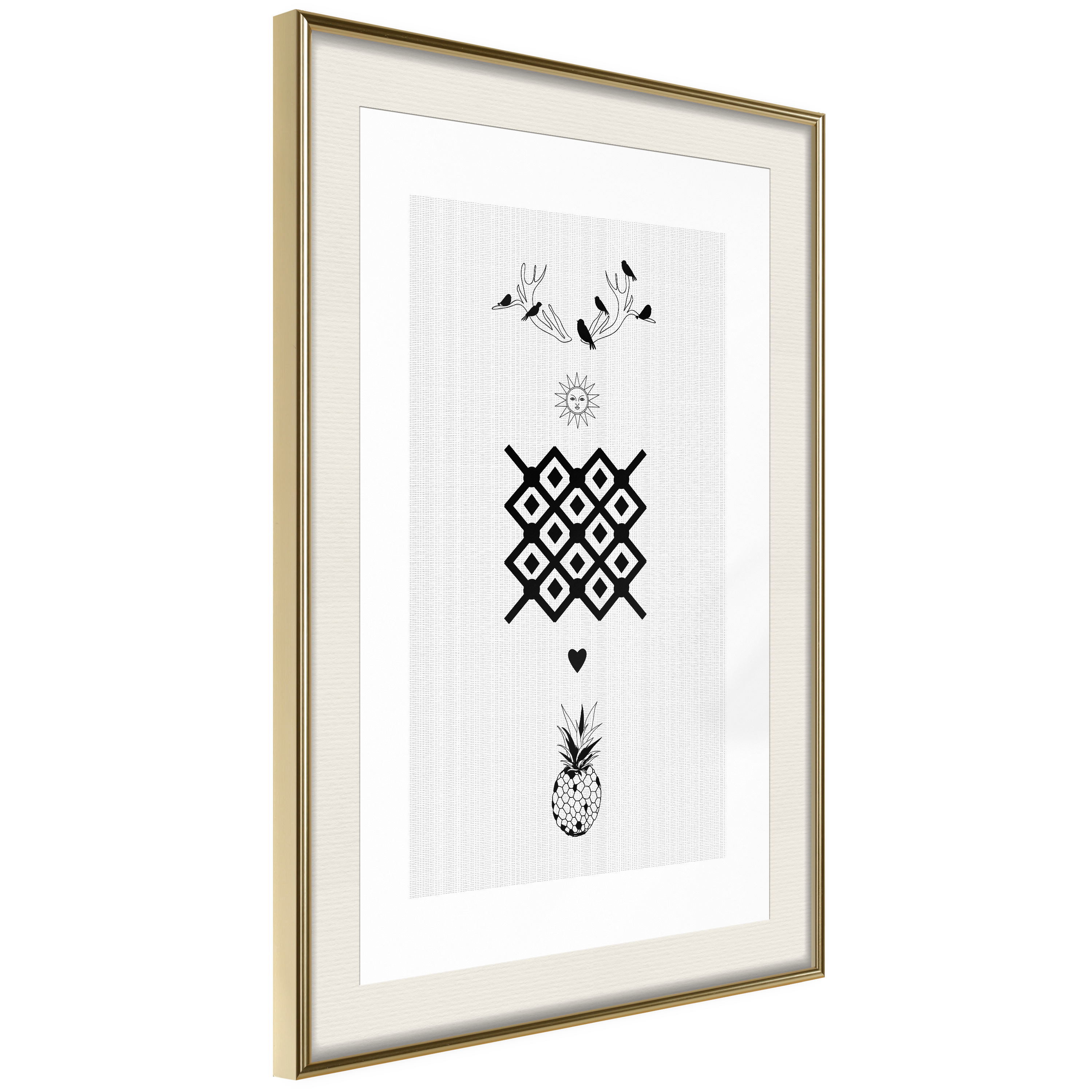 Passepartouten i écru betonar färgern på affischen och skapar en extra kontrast mellan grafiken, ramen och väggen. Dessutom ger den ramen ett svagt tredimensionellt intryck och fungerar även som ett skyddslager som ytterligare skyddar afischen. Affischen är säkrad med akrylglas och en hänganordning finns på ramens baksida.