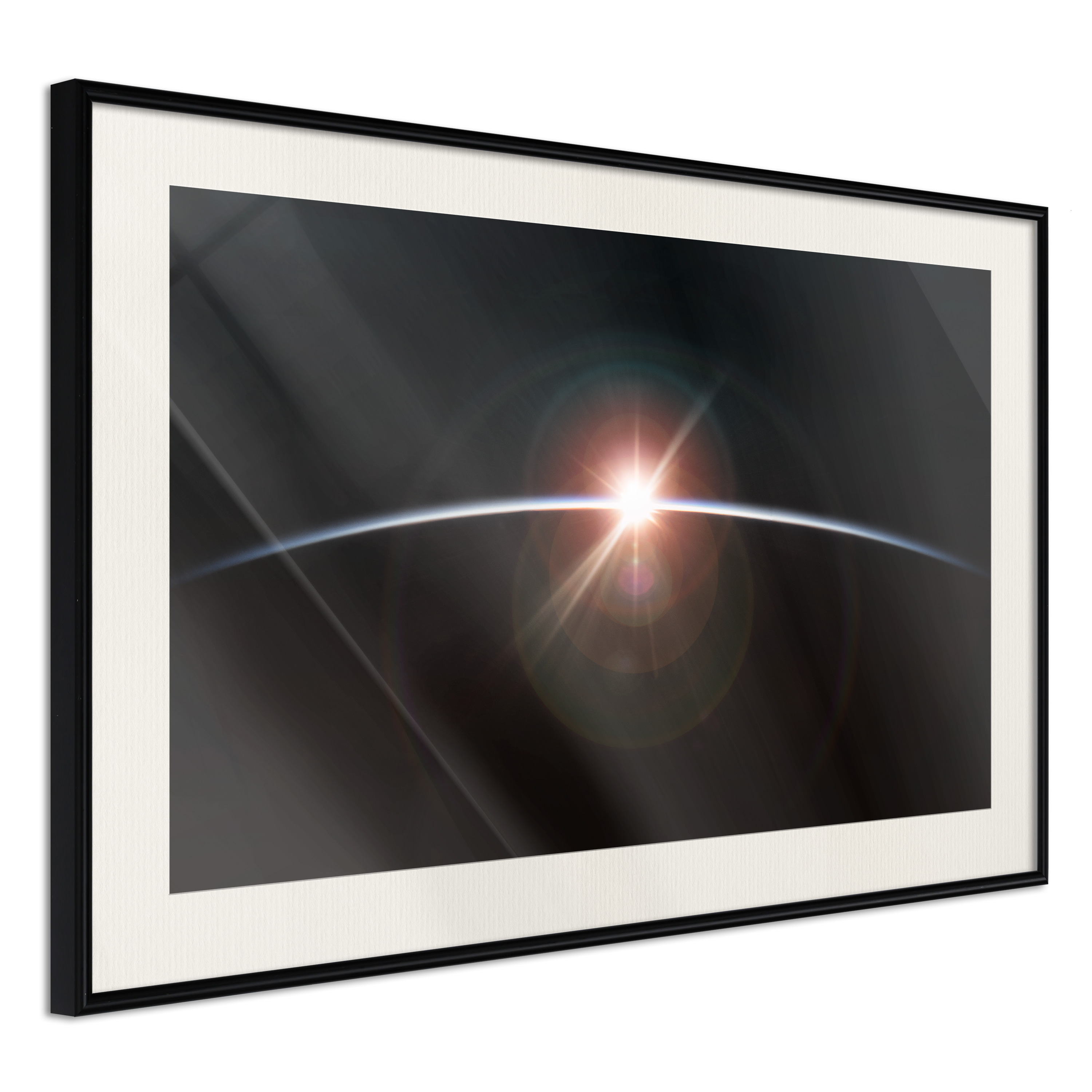 Passepartouten i écru betonar färgern på affischen och skapar en extra kontrast mellan grafiken, ramen och väggen. Dessutom ger den ramen ett svagt tredimensionellt intryck och fungerar även som ett skyddslager som ytterligare skyddar afischen. Affischen är säkrad med akrylglas och en hänganordning finns på ramens baksida.