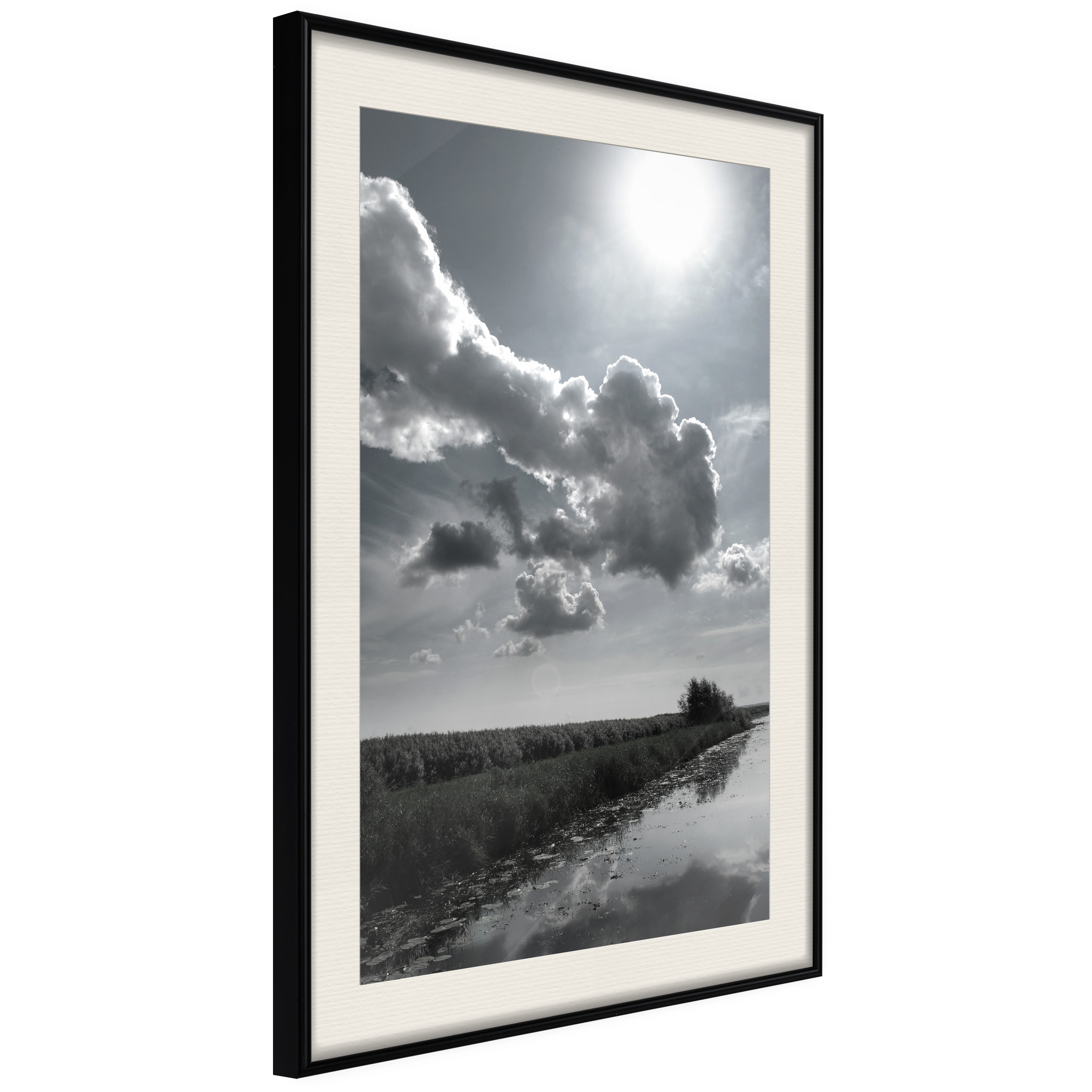 Passepartouten i écru betonar färgern på affischen och skapar en extra kontrast mellan grafiken, ramen och väggen. Dessutom ger den ramen ett svagt tredimensionellt intryck och fungerar även som ett skyddslager som ytterligare skyddar afischen. Affischen är säkrad med akrylglas och en hänganordning finns på ramens baksida.