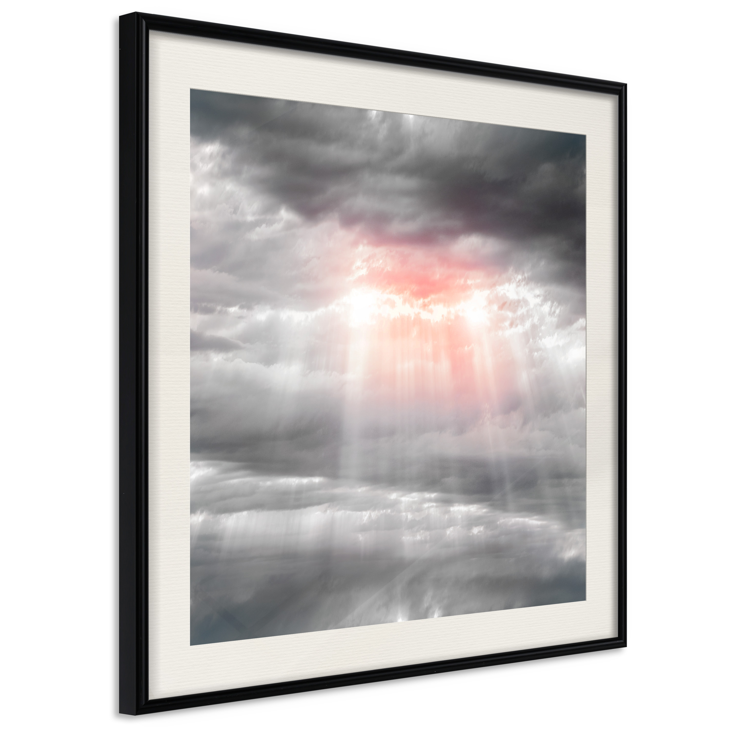 Passepartouten i écru betonar färgern på affischen och skapar en extra kontrast mellan grafiken, ramen och väggen. Dessutom ger den ramen ett svagt tredimensionellt intryck och fungerar även som ett skyddslager som ytterligare skyddar afischen. Affischen är säkrad med akrylglas och en hänganordning finns på ramens baksida.