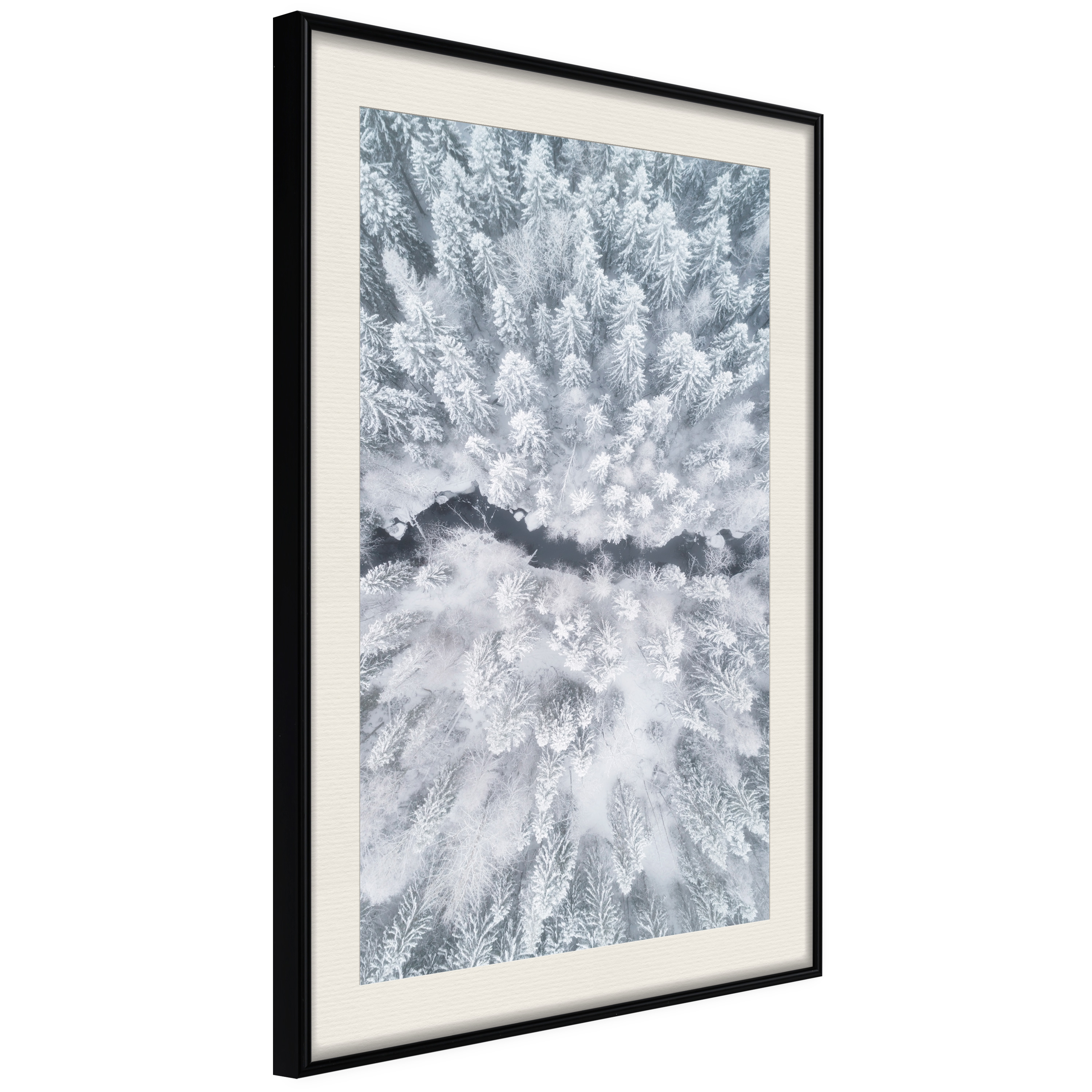 Passepartouten i écru betonar färgern på affischen och skapar en extra kontrast mellan grafiken, ramen och väggen. Dessutom ger den ramen ett svagt tredimensionellt intryck och fungerar även som ett skyddslager som ytterligare skyddar afischen. Affischen är säkrad med akrylglas och en hänganordning finns på ramens baksida.
