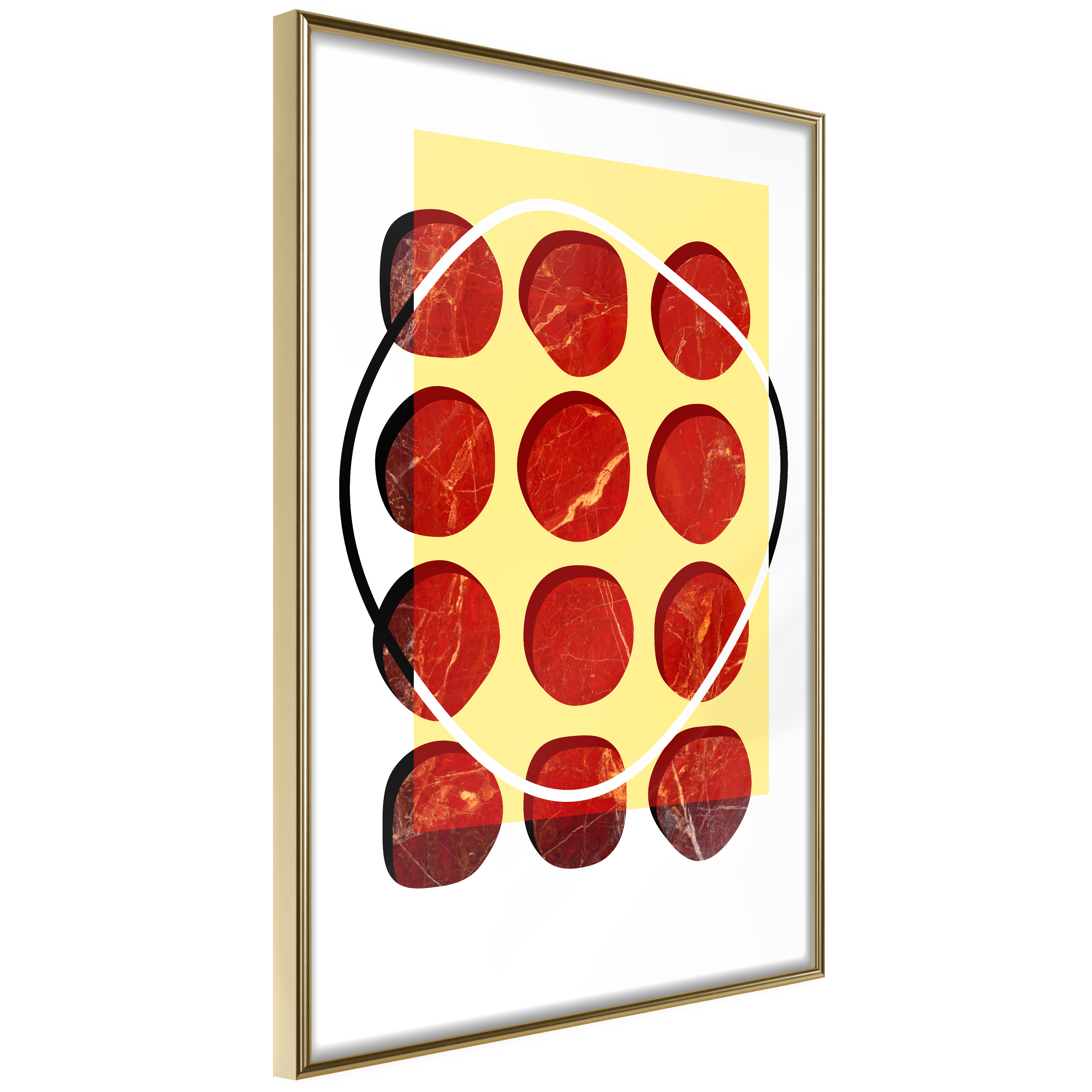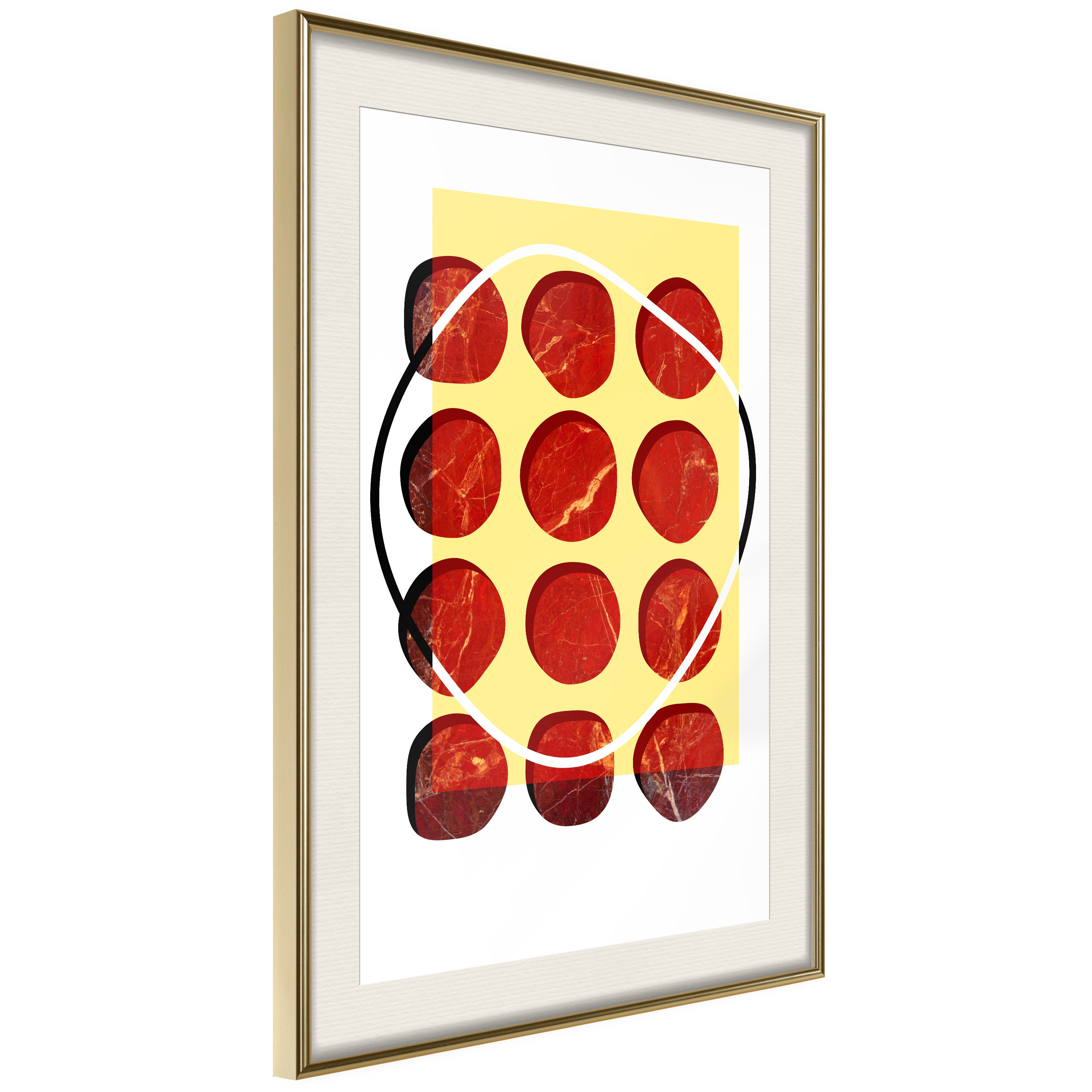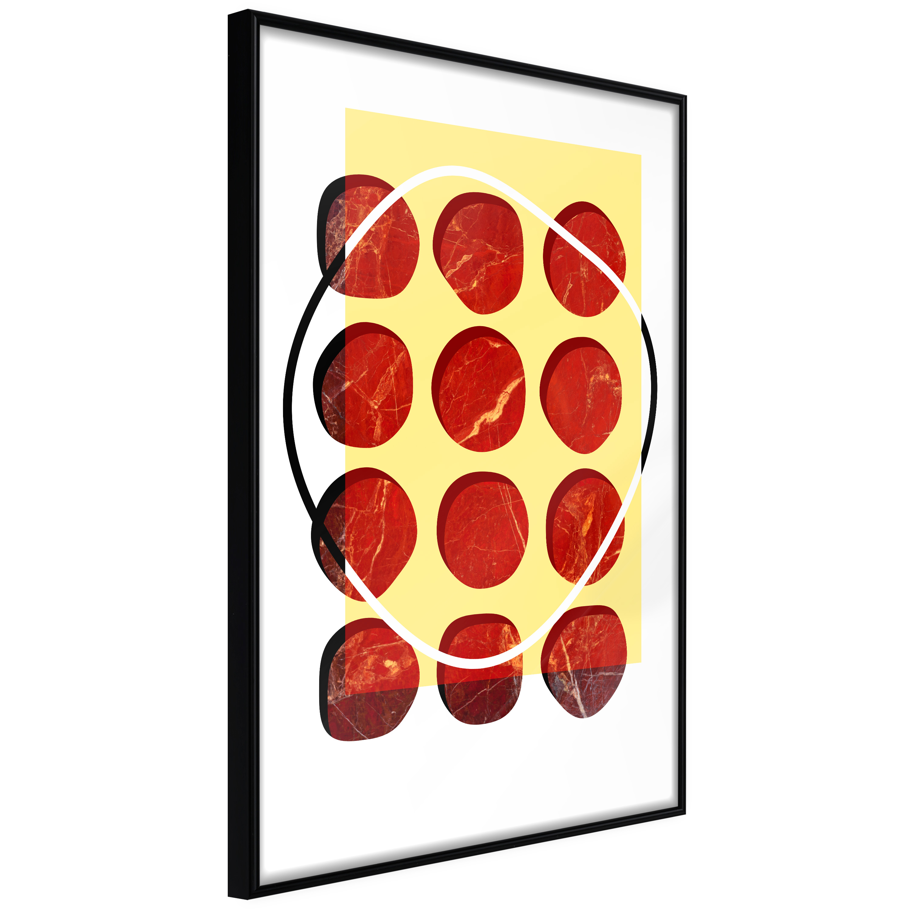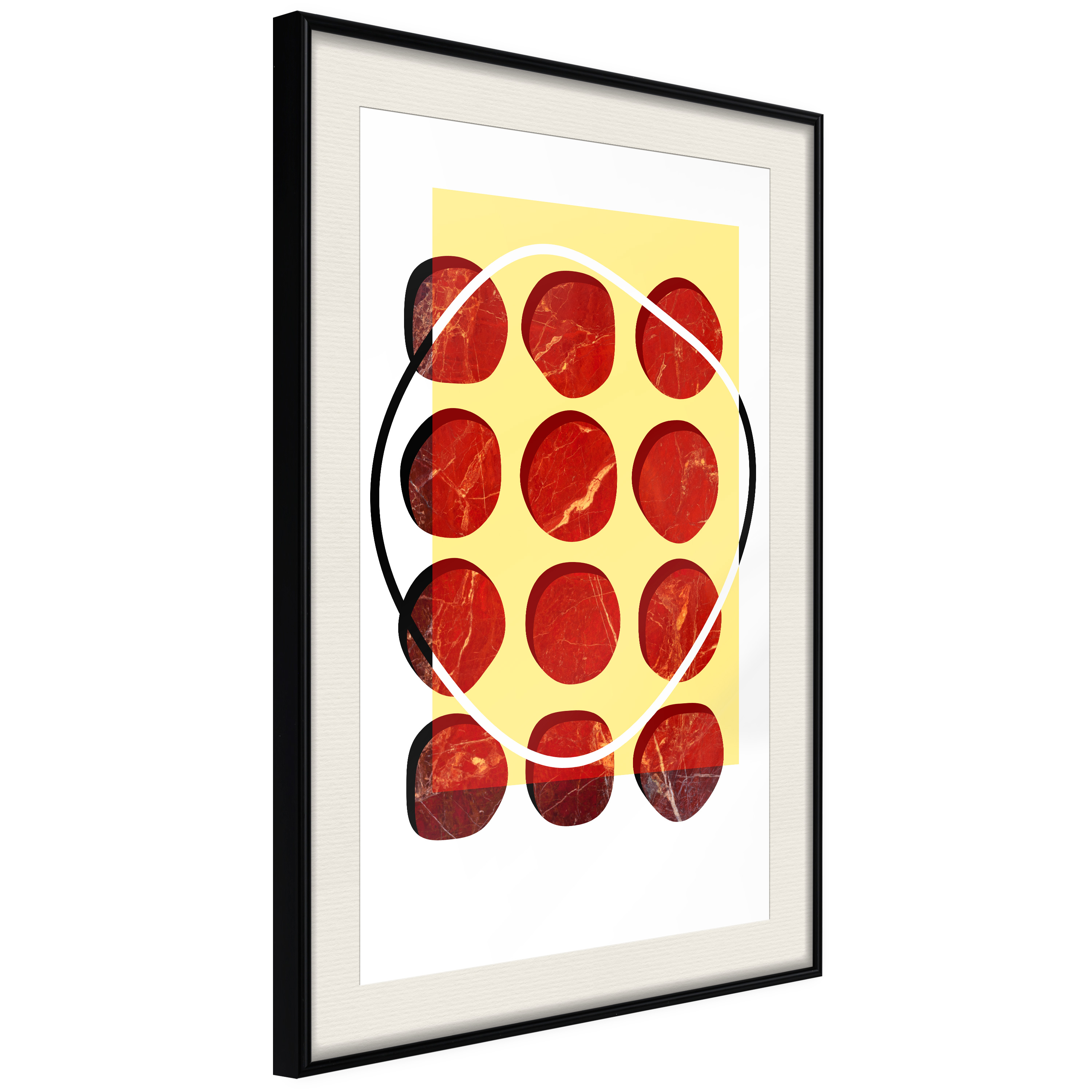 Passepartouten i écru betonar färgern på affischen och skapar en extra kontrast mellan grafiken, ramen och väggen. Dessutom ger den ramen ett svagt tredimensionellt intryck och fungerar även som ett skyddslager som ytterligare skyddar afischen. Affischen är säkrad med akrylglas och en hänganordning finns på ramens baksida.
