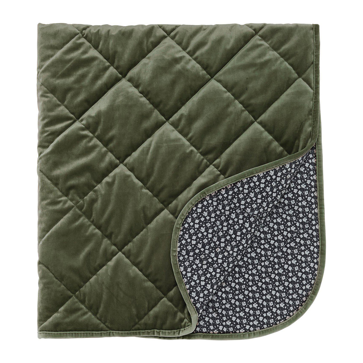 Emmet är en quiltad pläd med enfärgad sammet på ena sidan och mjukt bomullstyg med tryckt mönster på andra sidan. Produkten är certifierad enligt STANDARD 100 by OEKO-TEX®. Certifieringen garanterar att produkten är testad och fri från ämnen som kan vara skadliga för hälsan och miljön. 100% Polyester.
