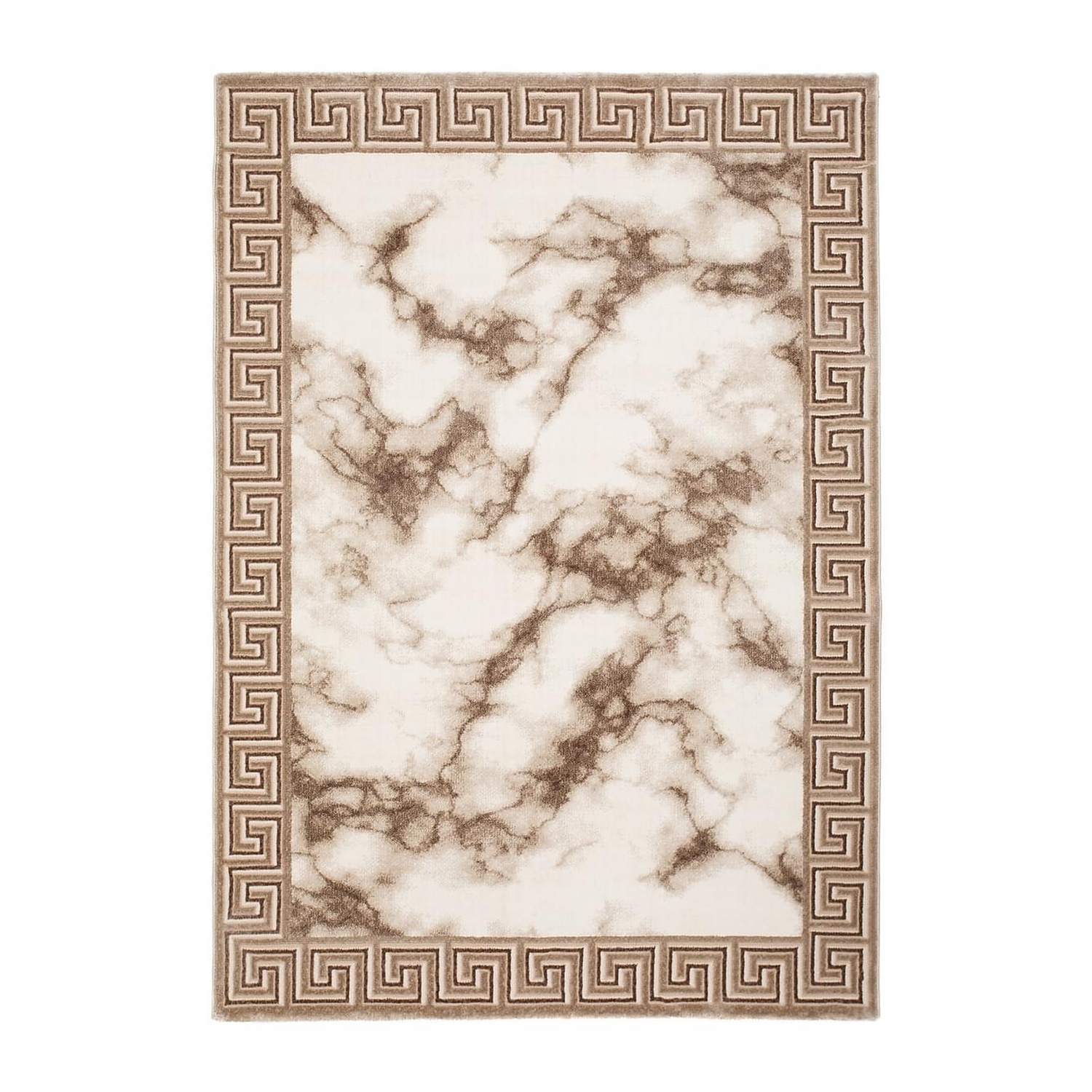 Friezematta KM Carpets Galya Versace har en vacker bottenfärg med matchande langettering på långsidorna. Mattan har ett marmorliknande mönster som ramas in av en meanderbård.