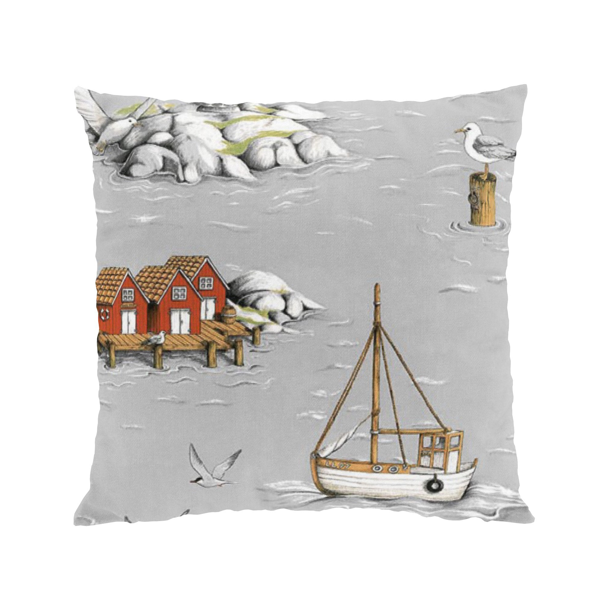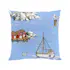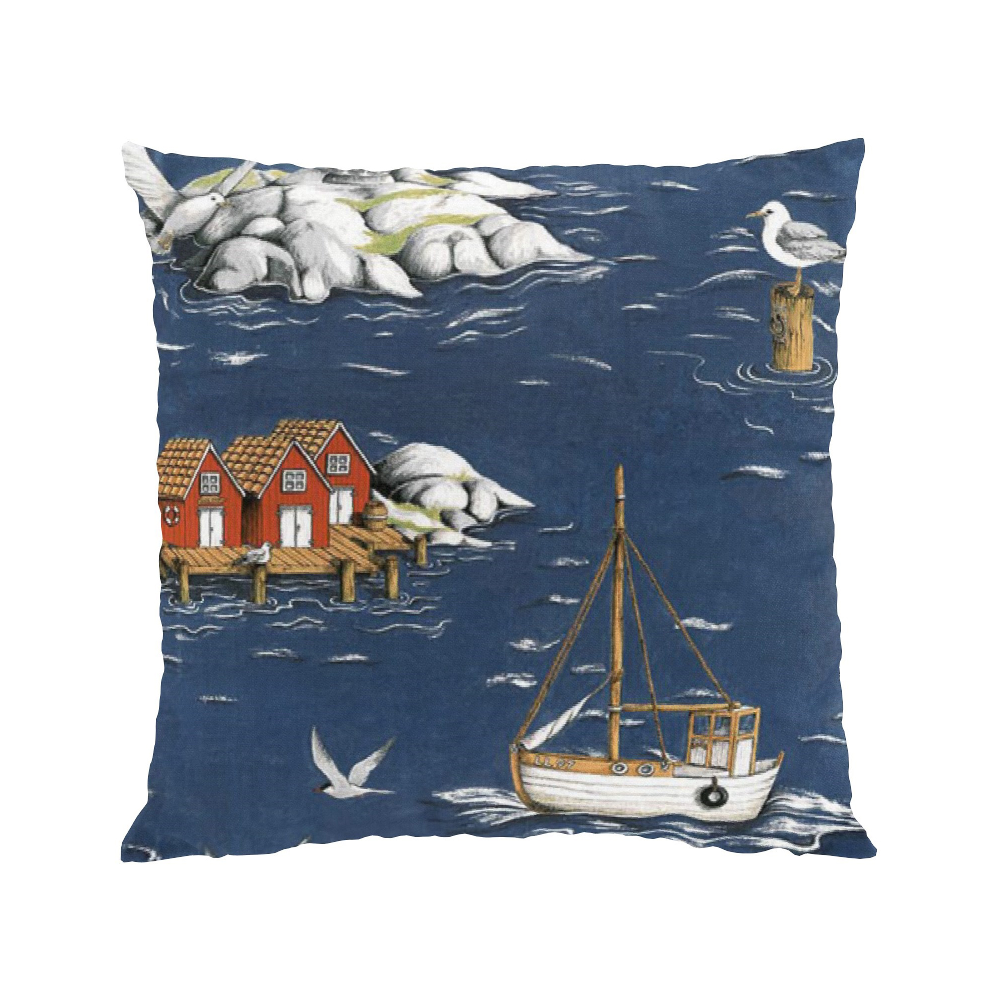 Kuddfodral från Arvidssons Textil. Svenskdesignat mönster av Carola Bengtsson-Malmström. I härligt kustmotiv med båtar, bodar & fåglar. Tillverkad i bomull.