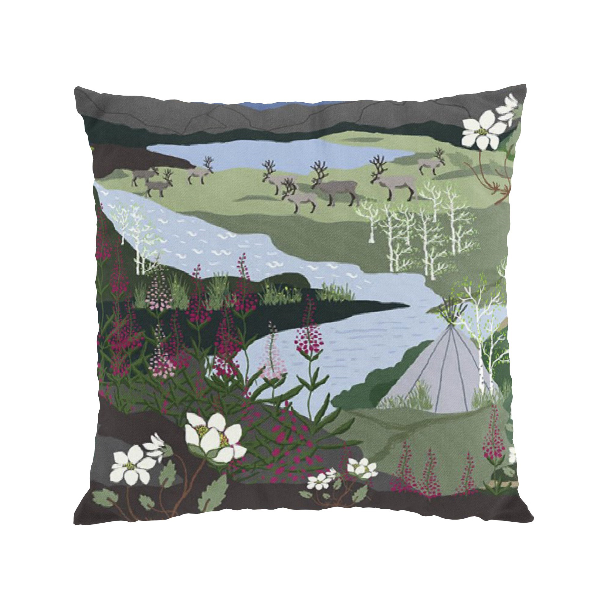 Kuddfodral Fjällvandring från Arvidssons Textil. Svenskdesignat mönster med motiv av härliga fjällandskap med renar och solnedgången. Design av Louise Videlyck.