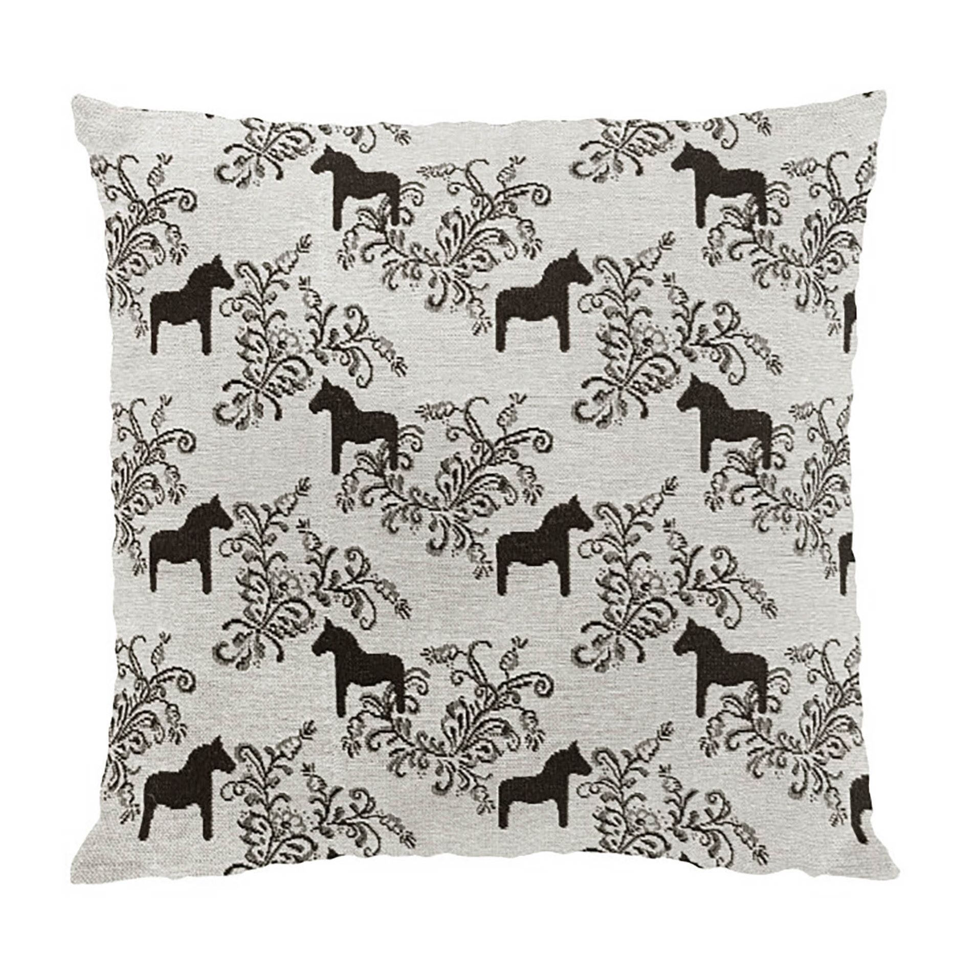 Kuddfodral från Arvidssons Textil. Svenskdesignat mönster med dalahästar och kurbitsmotiv.