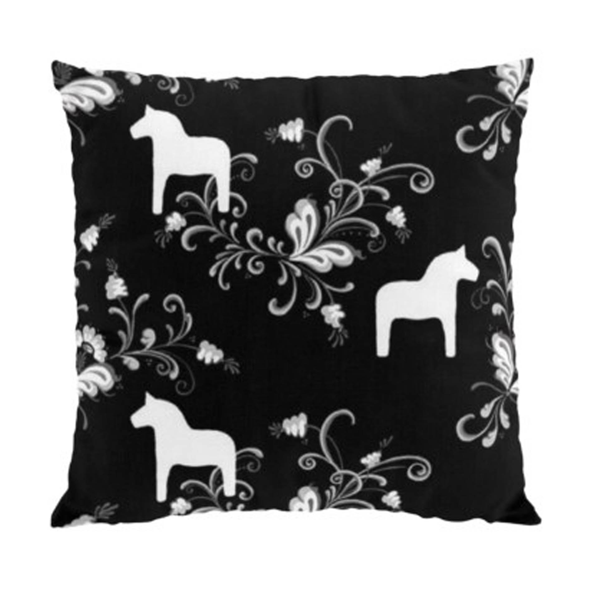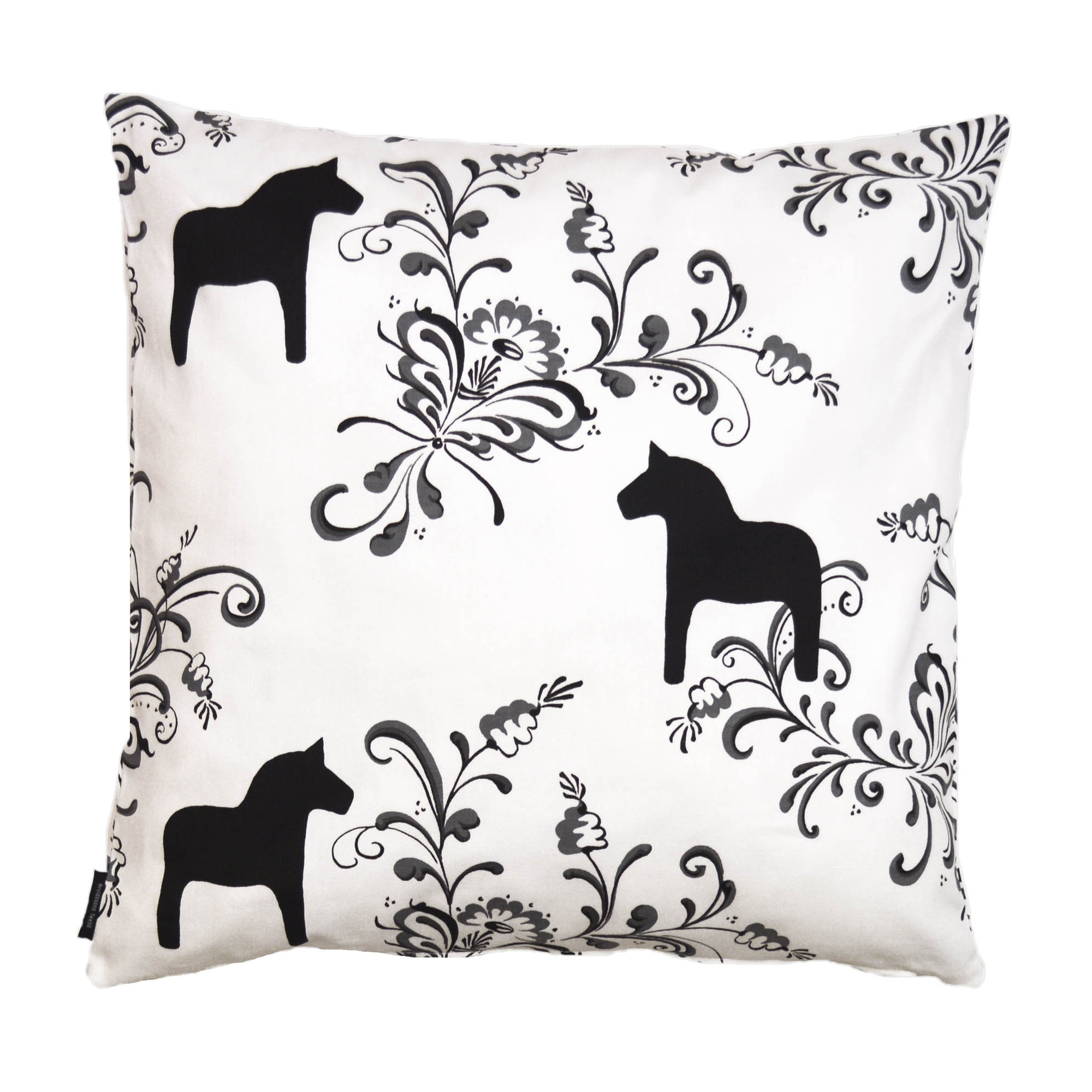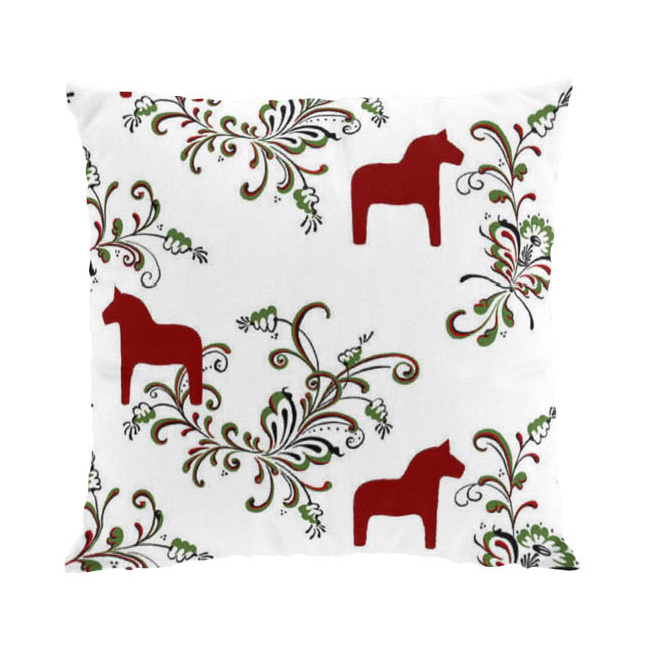 Kuddfodral Kurbits från Arvidssons Textil. Svenskdesignat mönster med dalahästar och kurbitsmotiv.