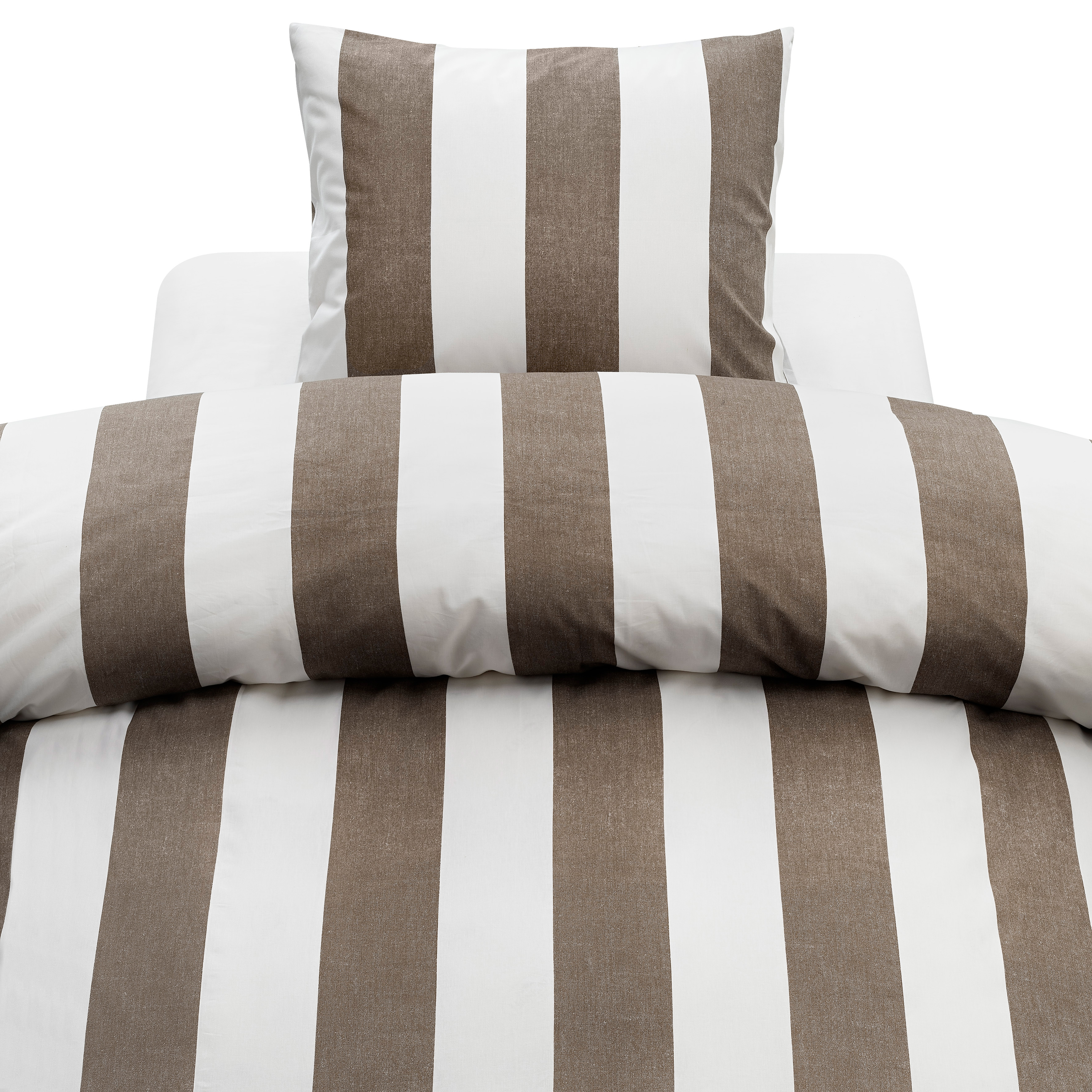 Borganäs bäddset med bruna och vita blockränder. Bestående av ett påslakan (150x210 cm) och ett örngott (50x60 cm), tillverkat av 100% bomull.