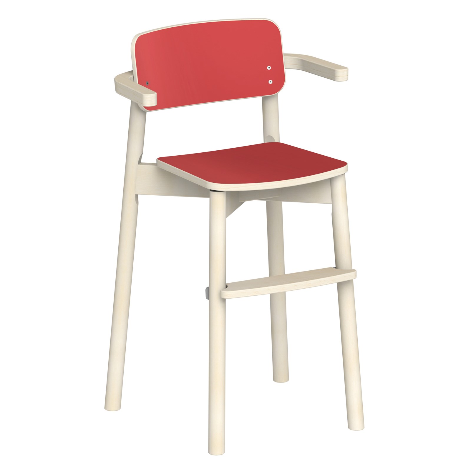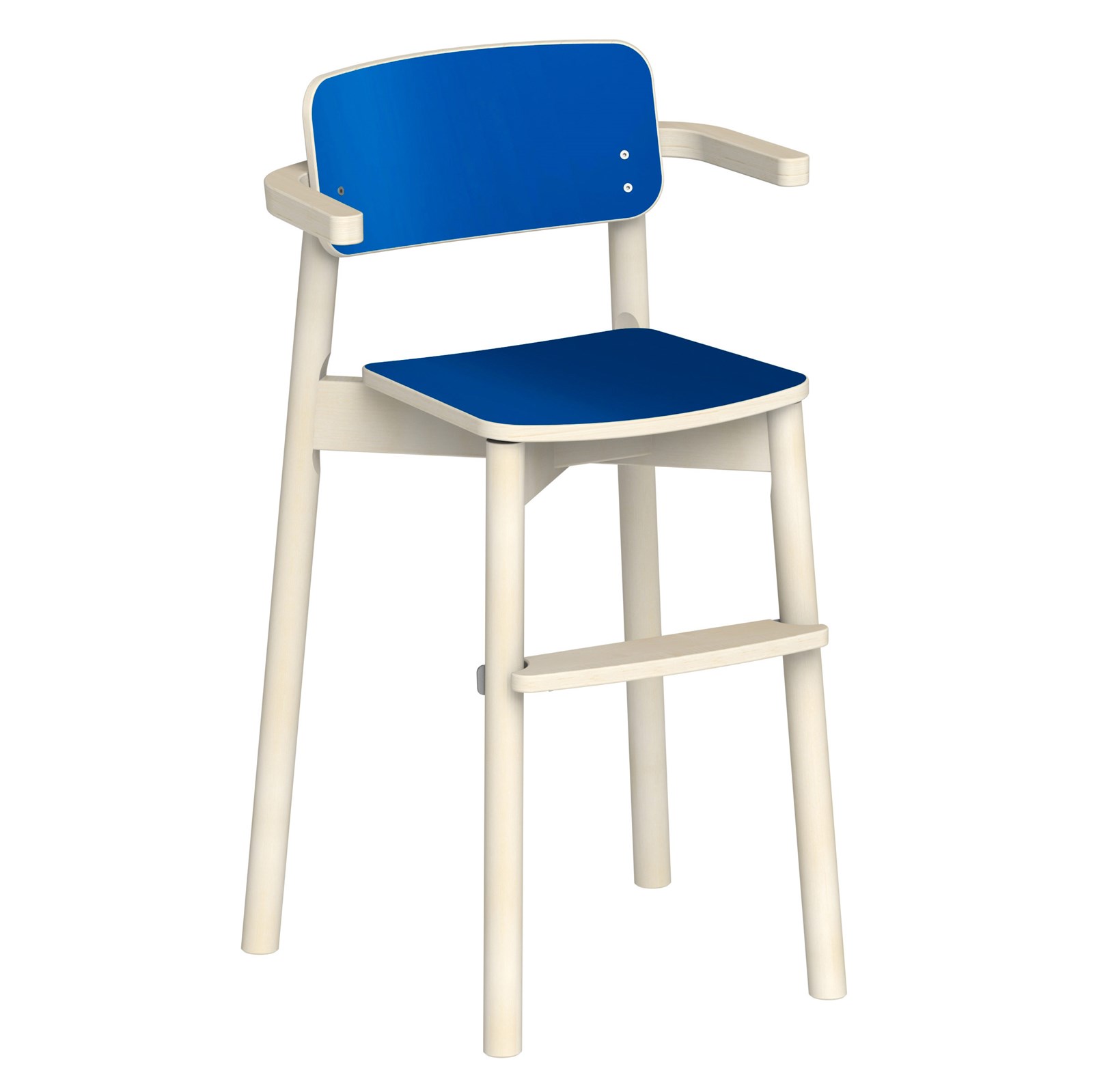 Barnstol Fanny från ABA Skol. Stomme i trä med sits- och ryggplatta i laminat. Upphängningsformade armstöd med bordsskydd. Godkänd enligt gällande EN-standard. Stapelbar. Filttassar medföljer.